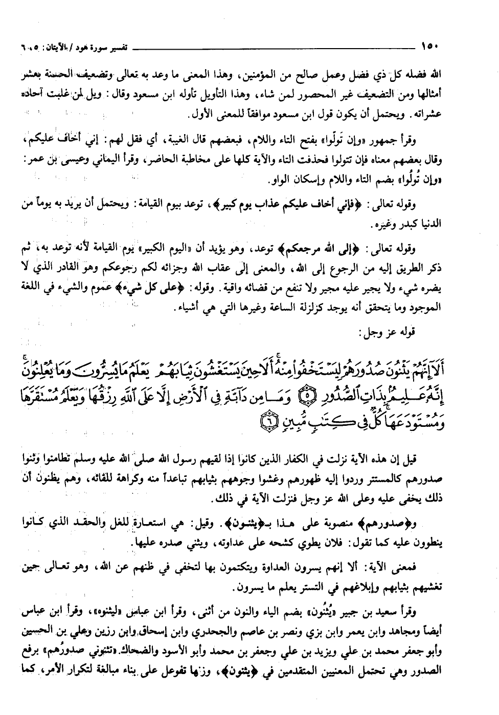 أَلا إِنَّهُمْ يَثْنُونَ صُدُورَهُمْ لِيَسْتَخْفُوا مِنْهُ أَلا حِينَ يَسْتَغْشُونَ ثِيابَهُمْ يَعْلَمُ ما يُسِرُّونَ وَما يُعْلِنُونَ إِنَّهُ عَلِيمٌ بِذاتِ الصُّدُورِ (٥) وَما مِنْ دَابَّةٍ فِي الْأَرْضِ إِلاَّ عَلَى اللَّهِ رِزْقُها وَيَعْلَمُ مُسْتَقَرَّها وَمُسْتَوْدَعَها كُلٌّ فِي كِتابٍ مُبِينٍ (٦)