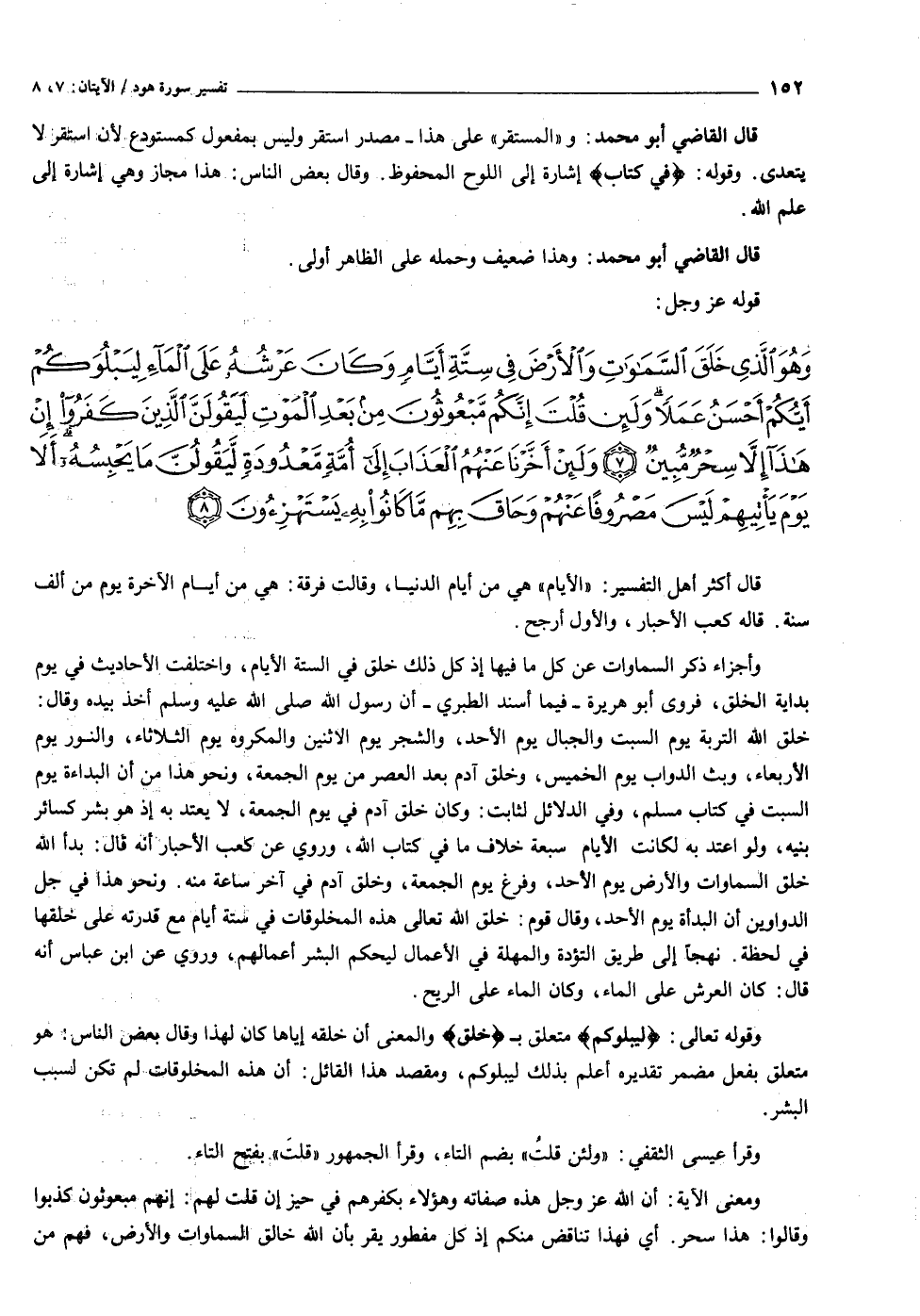 وَهُوَ الَّذِي خَلَقَ السَّماواتِ وَالْأَرْضَ فِي سِتَّةِ أَيَّامٍ وَكانَ عَرْشُهُ عَلَى الْماءِ لِيَبْلُوَكُمْ أَيُّكُمْ أَحْسَنُ عَمَلاً وَلَئِنْ قُلْتَ إِنَّكُمْ مَبْعُوثُونَ مِنْ بَعْدِ الْمَوْتِ لَيَقُولَنَّ الَّذِينَ كَفَرُوا إِنْ هذا إِلاَّ سِحْرٌ مُبِينٌ (٧) وَلَئِنْ أَخَّرْنا عَنْهُمُ الْعَذابَ إِلى أُمَّةٍ مَعْدُودَةٍ لَيَقُولُنَّ ما يَحْبِسُهُ أَلا يَوْمَ يَأْتِيهِمْ لَيْسَ مَصْرُوفاً عَنْهُمْ وَحاقَ بِهِمْ ما كانُوا بِهِ يَسْتَهْزِؤُنَ (٨)