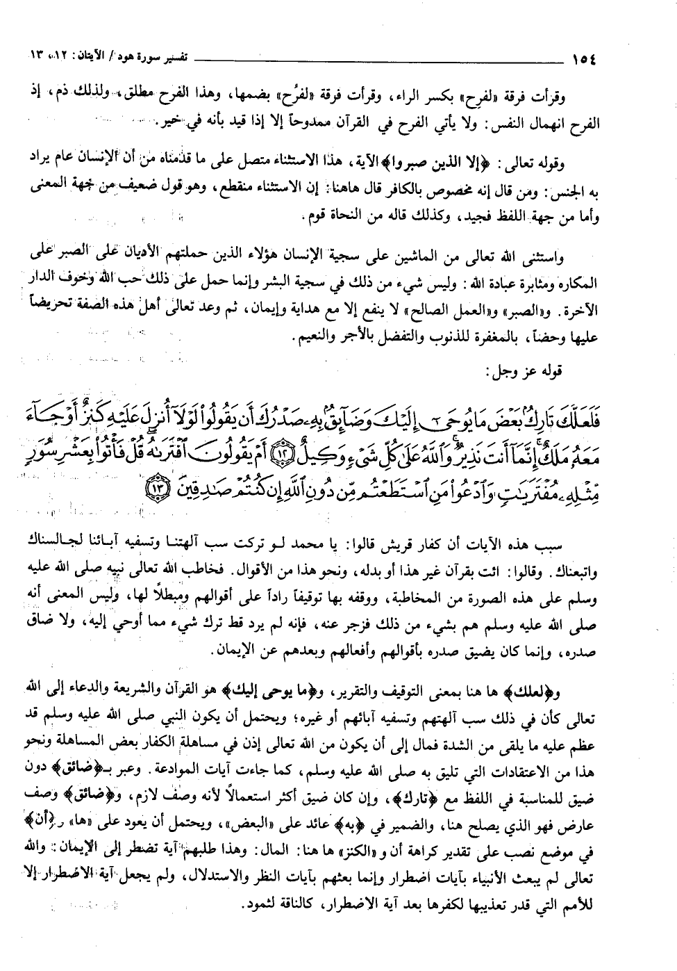 فَلَعَلَّكَ تارِكٌ بَعْضَ ما يُوحى إِلَيْكَ وَضائِقٌ بِهِ صَدْرُكَ أَنْ يَقُولُوا لَوْلا أُنْزِلَ عَلَيْهِ كَنْزٌ أَوْ جاءَ مَعَهُ مَلَكٌ إِنَّما أَنْتَ نَذِيرٌ وَاللَّهُ عَلى كُلِّ شَيْءٍ وَكِيلٌ (١٢) أَمْ يَقُولُونَ افْتَراهُ قُلْ فَأْتُوا بِعَشْرِ سُوَرٍ مِثْلِهِ مُفْتَرَياتٍ وَادْعُوا مَنِ اسْتَطَعْتُمْ مِنْ دُونِ اللَّهِ إِنْ كُنْتُمْ صادِقِينَ (١٣)
