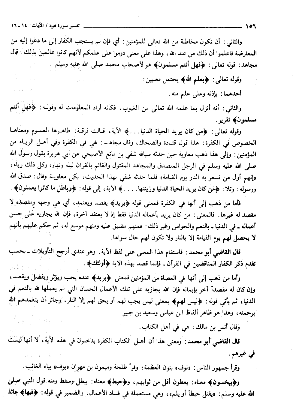وقوله تعالى: مَنْ كانَ يُرِيدُ الْحَياةَ الدُّنْيا ... الآية، قالت فرقة: ظاهرها العموم ومعناها الخصوص في الكفرة: هذا قول قتادة والضحاك، وقال مجاهد: هي في الكفرة وفي أهل الرياء من المؤمنين: وإلى هذا ذهب معاوية حين حدثه سيافه شفي بن ماتع الأصبحي عن أبي هريرة بقول رسول الله صلى الله عليه وسلم في الرجل المتصدق والمجاهد المقتول والقائم بالقرآن ليله ونهاره وكل ذلك رياء، «إنهم أول من تسعر به النار يوم القيامة» فلما حدثه شفي بهذا الحديث، بكى معاوية وقال: صدق الله ورسوله: وتلا: مَنْ كانَ يُرِيدُ الْحَياةَ الدُّنْيا وَزِينَتَها ... الآية، إلى قوله: وَباطِلٌ ما كانُوا يَعْمَلُونَ.