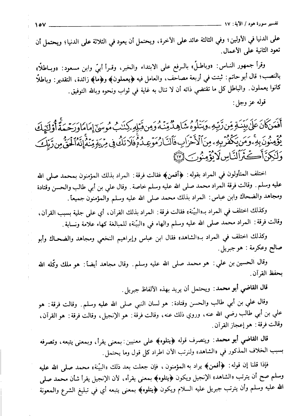 أَفَمَنْ كانَ عَلى بَيِّنَةٍ مِنْ رَبِّهِ وَيَتْلُوهُ شاهِدٌ مِنْهُ وَمِنْ قَبْلِهِ كِتابُ مُوسى إِماماً وَرَحْمَةً أُولئِكَ يُؤْمِنُونَ بِهِ وَمَنْ يَكْفُرْ بِهِ مِنَ الْأَحْزابِ فَالنَّارُ مَوْعِدُهُ فَلا تَكُ فِي مِرْيَةٍ مِنْهُ إِنَّهُ الْحَقُّ مِنْ رَبِّكَ وَلكِنَّ أَكْثَرَ النَّاسِ لا يُؤْمِنُونَ (١٧)