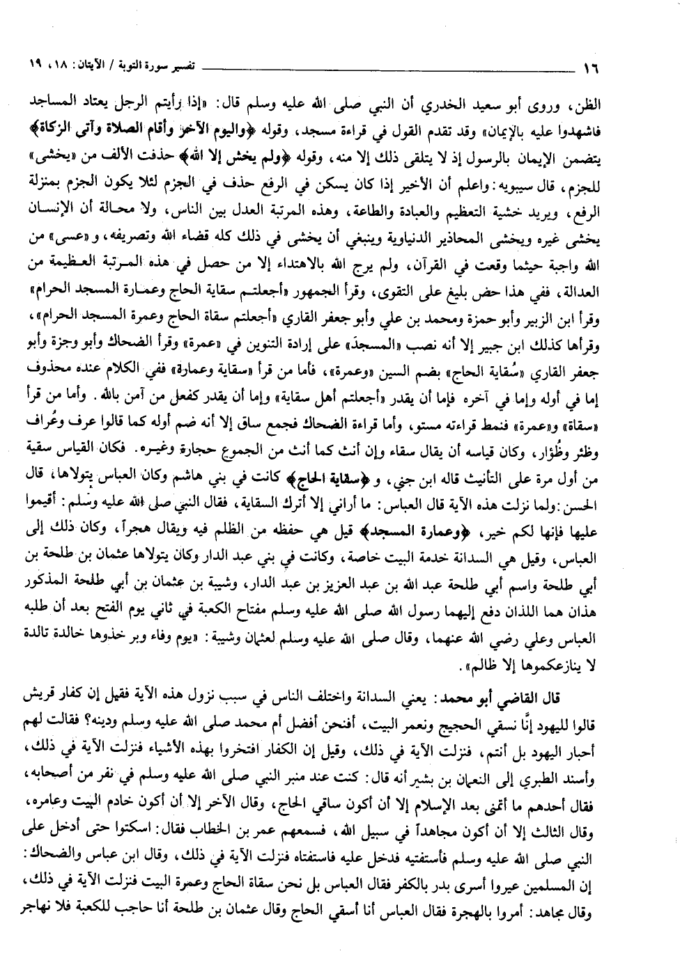الظن، وروى أبو سعيد الخدري أن النبي صلى الله عليه وسلم قال: «إذا رأيتم الرجل يعتاد المساجد فاشهدوا عليه بالإيمان» وقد تقدم القول في قراءة مسجد، وقوله وَالْيَوْمِ الْآخِرِ وَأَقامَ الصَّلاةَ وَآتَى الزَّكاةَ يتضمن الإيمان بالرسول إذ لا يتلقى ذلك إلا منه، وقوله وَلَمْ يَخْشَ إِلَّا اللَّهَ حذفت الألف من «يخشى» للجزم، قال سيبويه: واعلم أن الأخير إذا كان يسكن في الرفع حذف في الجزم لئلا يكون الجزم بمنزلة الرفع، ويريد خشية التعظيم والعبادة والطاعة، وهذه المرتبة العدل بين الناس، ولا محالة أن الإنسان يخشى غيره ويخشى المحاذير الدنياوية وينبغي أن يخشى في ذلك كله قضاء الله وتصريفه، و «عسى» من الله واجبة حيثما وقعت في القرآن، ولم يرج الله بالاهتداء إلا من حصل في هذه المرتبة العظيمة من العدالة، ففي هذا حض بليغ على التقوى، وقرأ الجمهور «أجعلتم سقاية الحاج وعمارة المسجد الحرام» وقرأ ابن الزبير وأبو حمزة ومحمد بن علي وأبو جعفر القاري «أجعلتم سقاة الحاج وعمرة المسجد الحرام» ، وقرأها كذلك ابن جبير إلا أنه نصب «المسجد» على إرادة التنوين في «عمرة» وقرأ الضحاك وأبو وجزة وأبو جعفر القاري «سقاية الحاج» بضم السين «وعمرة» ، فأما من قرأ «سقاية وعمارة» ففي الكلام عنده محذوف إما في أوله وإما في آخره فإما أن يقدر «أجعلتم أهل سقاية» وإما أن يقدر كفعل من آمن بالله. وأما من قرأ «سقاة» و «عمرة» فنمط قراءته مستو، وأما قراءة الضحاك فجمع ساق إلا أنه ضم أوله كما قالوا عرف وعراف وظئر وظؤار، وكان قياسه أن يقال سقاء وإن أنث كما أنث من الجموع حجارة وغيره. فكان القياس سقية من أول مرة على التأنيث قاله ابن جني، وسِقايَةَ الْحاجِّ كانت في بني هاشم وكان العباس يتولاها، سقية من أول مرة على التأنيث قاله ابن جني، وسِقايَةَ الْحاجِّ كانت في بني هاشم وكان العباس يتولاها، قال الحسن: ولما نزلت هذه الآية قال العباس: ما أراني إلا أترك السقاية، فقال النبي صلى الله عليه وسلم: أقيموا عليها فإنها لكم خير، وَعِمارَةَ الْمَسْجِدِ قيل هي حفظه من الظلم فيه ويقال هجرا، وكان ذلك إلى العباس، وقيل هي السدانة خدمة البيت خاصة، وكانت في بني عبد الدار وكان يتولاها عثمان بن طلحة بن أبي طلحة واسم أبي طلحة عبد الله بن عبد العزيز بن عبد الدار، وشيبة بن عثمان بن أبي طلحة المذكور هذان هما اللذان دفع إليهما رسول الله صلى الله عليه وسلم مفتاح الكعبة في ثاني يوم الفتح بعد أن طلبه العباس وعلي رضي الله عنهما، وقال صلى الله عليه وسلم لعثمان وشيبة: «يوم وفاء وبر خذوها خالدة تالدة لا ينازعكموها إلا ظالم» .