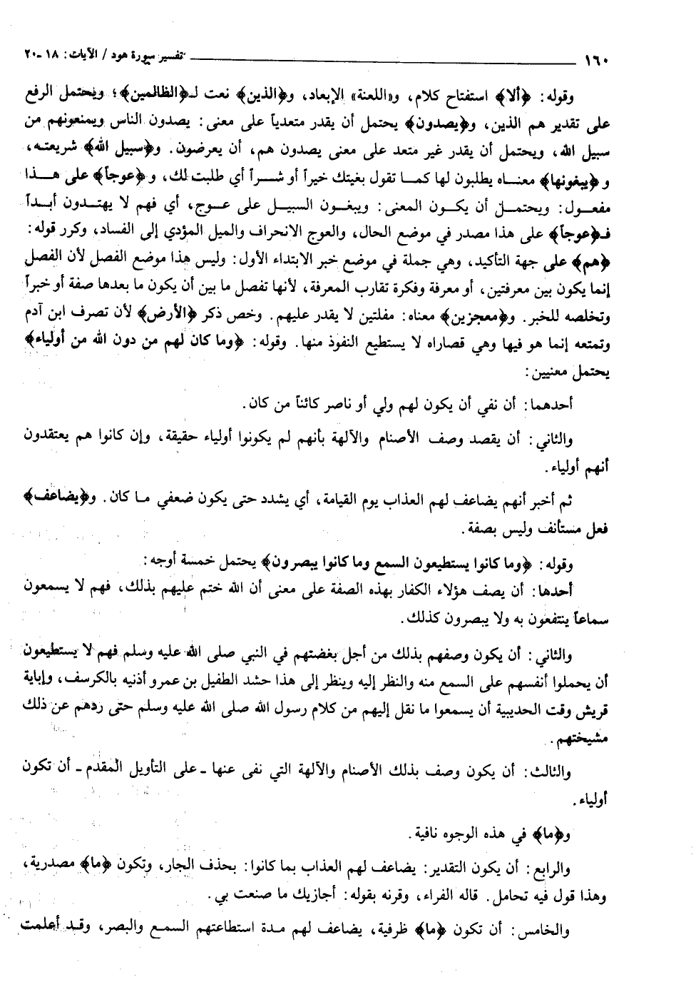 وقوله: أَلا استفتاح كلام، و «اللعنة» الإبعاد، والَّذِينَ نعت ل الظَّالِمِينَ ويحتمل الرفع على تقدير هم الذين، ويَصُدُّونَ يحتمل أن يقدر متعديا على معنى: يصدون الناس ويمنعونهم من سبيل الله، ويحتمل أن يقدر غير متعد على معنى يصدون هم، أن يعرضون. وسَبِيلِ اللَّهِ شريعته، ويَبْغُونَها معناه يطلبون لها كما تقول بغيتك خيرا أو شرا أي طلبت لك، وعِوَجاً على هذا مفعول: ويحتمل أن يكون المعنى: ويبغون السبيل على عوج، أي فهم لا يهتدون أبدا ف عِوَجاً على هذا مصدر في موضع الحال، والعوج الانحراف والميل المؤدي إلى الفساد، وكرر قوله:
