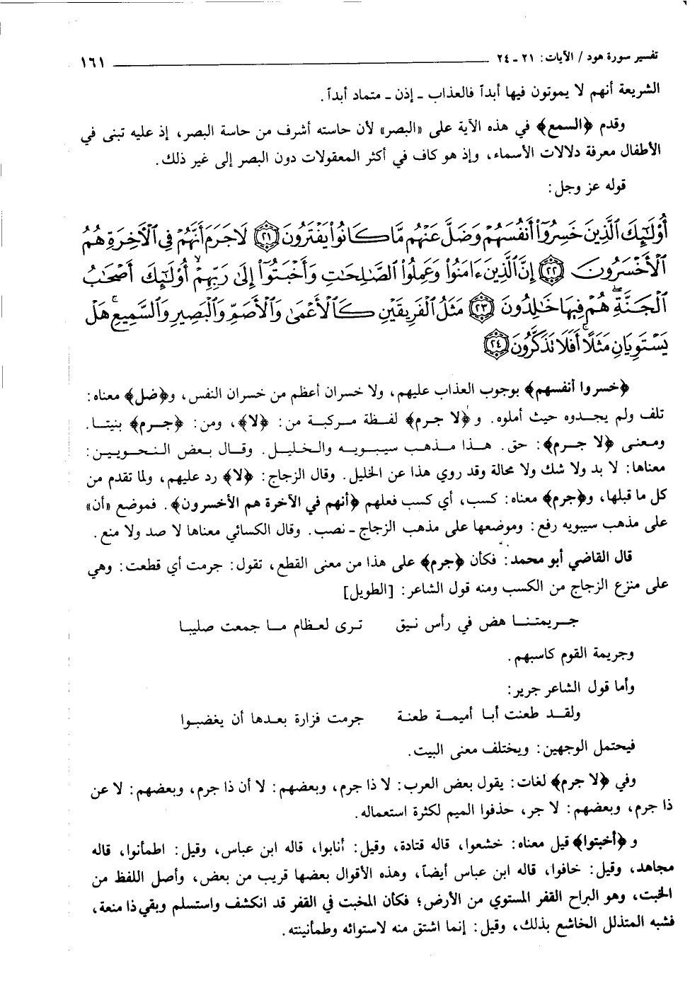 أُولئِكَ الَّذِينَ خَسِرُوا أَنْفُسَهُمْ وَضَلَّ عَنْهُمْ ما كانُوا يَفْتَرُونَ (٢١) لا جَرَمَ أَنَّهُمْ فِي الْآخِرَةِ هُمُ الْأَخْسَرُونَ (٢٢) إِنَّ الَّذِينَ آمَنُوا وَعَمِلُوا الصَّالِحاتِ وَأَخْبَتُوا إِلى رَبِّهِمْ أُولئِكَ أَصْحابُ الْجَنَّةِ هُمْ فِيها خالِدُونَ (٢٣) مَثَلُ الْفَرِيقَيْنِ كَالْأَعْمى وَالْأَصَمِّ وَالْبَصِيرِ وَالسَّمِيعِ هَلْ يَسْتَوِيانِ مَثَلاً أَفَلا تَذَكَّرُونَ (٢٤)
