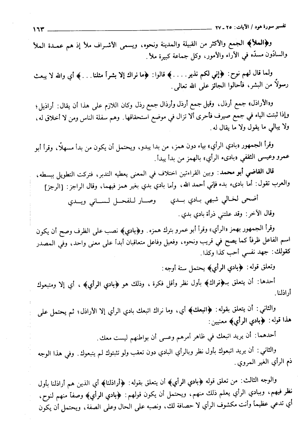 والوجه الثالث: من تعلق قوله بادِيَ الرَّأْيِ أن يتعلق بقوله: أَراذِلُنا أي الذين هم أراذلنا بأول نظر فيهم، ويبادي الرأي يعلم ذلك منهم، ويحتمل أن يكون قولهم: بادِيَ الرَّأْيِ وصفا منهم لنوح، أي تدعي عظيما وأنت مكشوف الرأي لا حصافة لك، ونصبه على الحال وعلى الصفة، ويحتمل أن يكون