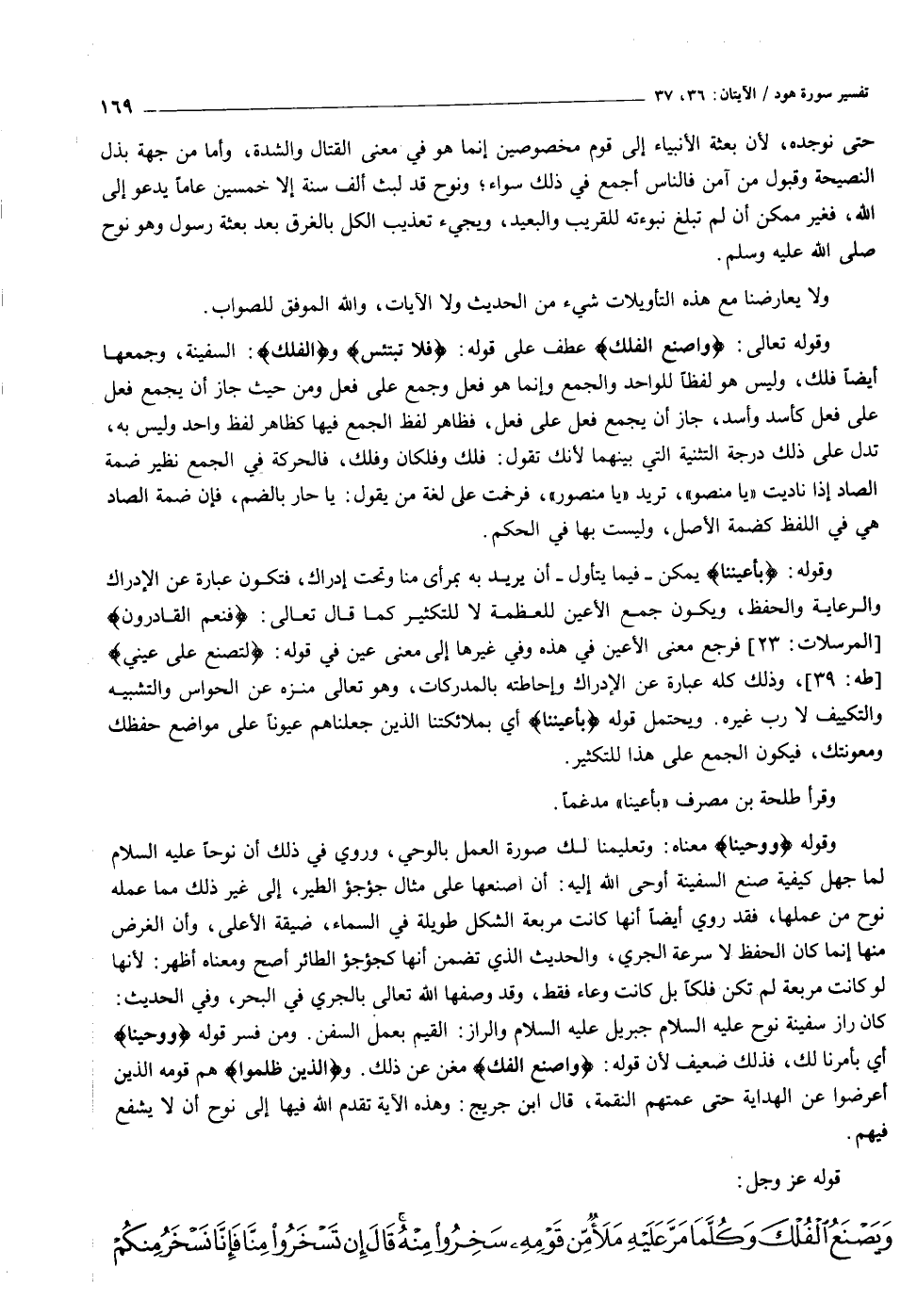 وقوله تعالى: وَاصْنَعِ الْفُلْكَ عطف على قوله: فَلا تَبْتَئِسْ والْفُلْكَ: السفينة، وجمعها أيضا فلك، وليس هو لفظا للواحد والجمع وإنما هو فعل وجمع على فعل ومن حيث جاز أن يجمع فعل على فعل كأسد وأسد، جاز أن يجمع فعل على فعل، فظاهر لفظ الجمع فيها كظاهر لفظ واحد وليس به، تدل على ذلك درجة التثنية التي بينهما لأنك تقول: فلك وفلكان وفلك، فالحركة في الجمع نظير ضمة الصاد إذا ناديت «يا منصور» ، تريد «يا منصور» ، فرخمت على لغة من يقول: يا حار بالضم، فإن ضمة الصاد هي في اللفظ كضمة الأصل، وليست بها في الحكم.
