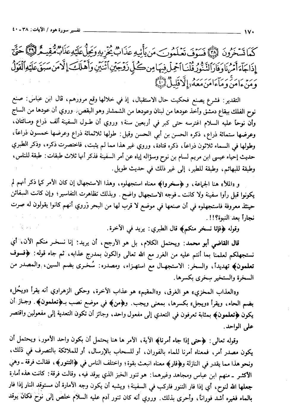 وَيَصْنَعُ الْفُلْكَ وَكُلَّما مَرَّ عَلَيْهِ مَلَأٌ مِنْ قَوْمِهِ سَخِرُوا مِنْهُ قالَ إِنْ تَسْخَرُوا مِنَّا فَإِنَّا نَسْخَرُ مِنْكُمْ كَما تَسْخَرُونَ (٣٨) فَسَوْفَ تَعْلَمُونَ مَنْ يَأْتِيهِ عَذابٌ يُخْزِيهِ وَيَحِلُّ عَلَيْهِ عَذابٌ مُقِيمٌ (٣٩) حَتَّى إِذا جاءَ أَمْرُنا وَفارَ التَّنُّورُ قُلْنَا احْمِلْ فِيها مِنْ كُلٍّ زَوْجَيْنِ اثْنَيْنِ وَأَهْلَكَ إِلاَّ مَنْ سَبَقَ عَلَيْهِ الْقَوْلُ وَمَنْ آمَنَ وَما آمَنَ مَعَهُ إِلاَّ قَلِيلٌ (٤٠)