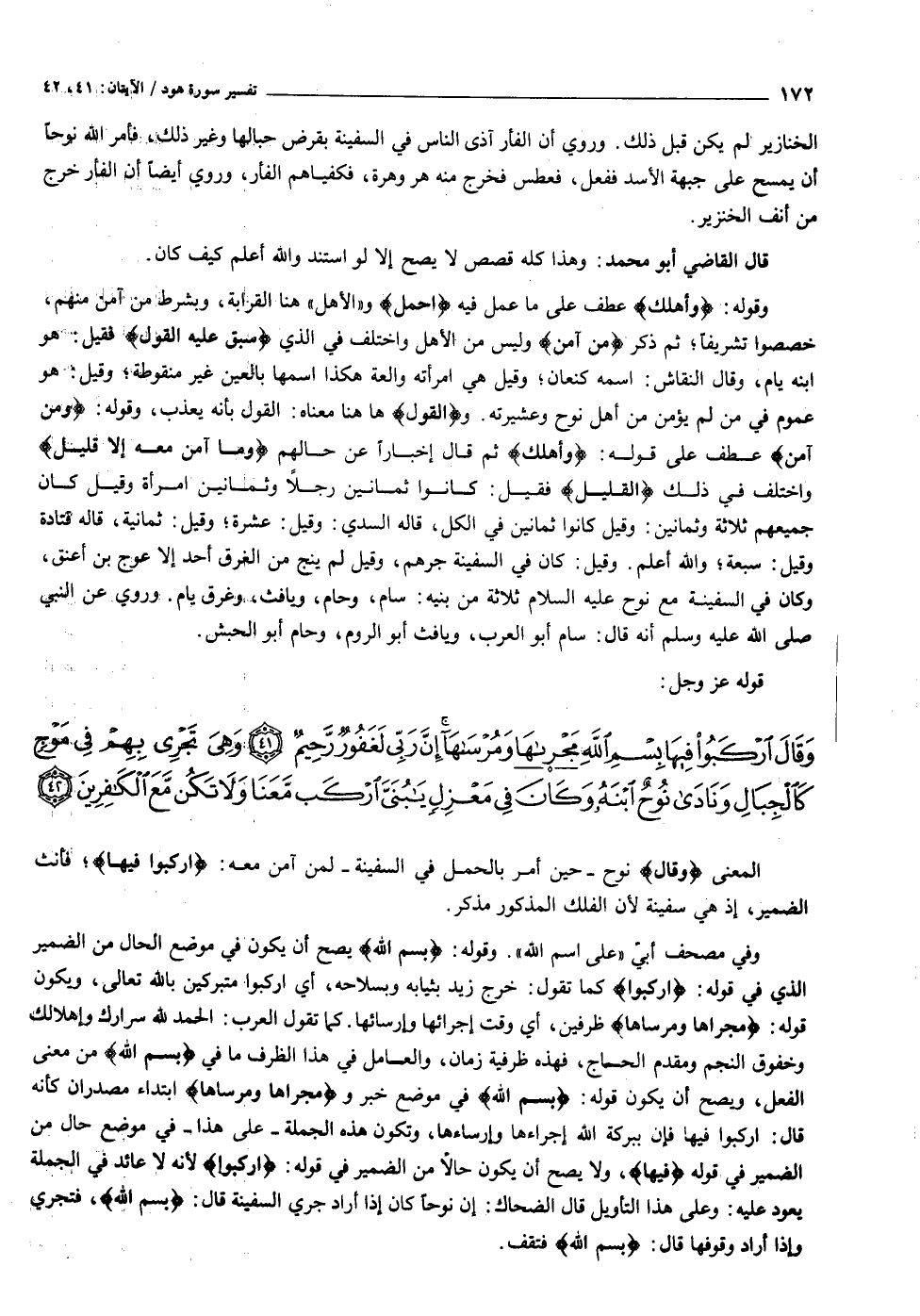 وَقالَ ارْكَبُوا فِيها بِسْمِ اللَّهِ مَجْراها وَمُرْساها إِنَّ رَبِّي لَغَفُورٌ رَحِيمٌ (٤١) وَهِيَ تَجْرِي بِهِمْ فِي مَوْجٍ كَالْجِبالِ وَنادى نُوحٌ ابْنَهُ وَكانَ فِي مَعْزِلٍ يا بُنَيَّ ارْكَبْ مَعَنا وَلا تَكُنْ مَعَ الْكافِرِينَ (٤٢)