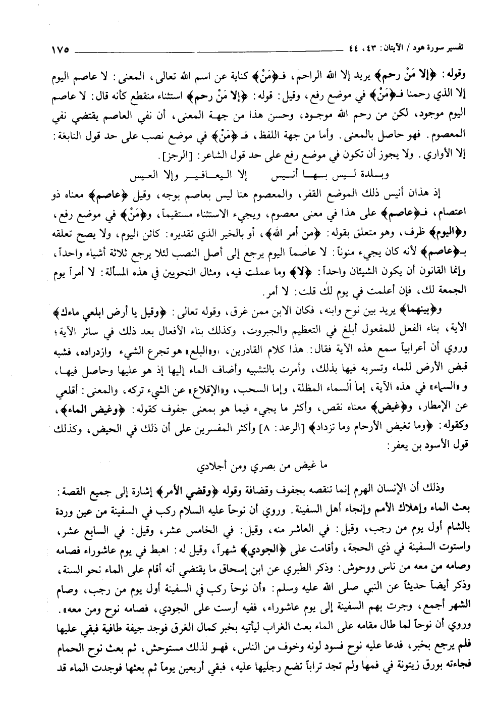 وقوله: إِلَّا مَنْ رَحِمَ يريد إلا الله الراحم، ف مِنَ كناية عن اسم الله تعالى، المعنى: لا عاصم اليوم إلا الذي رحمنا ف مِنَ في موضع رفع، وقيل: قوله: إِلَّا مَنْ رَحِمَ استثناء منقطع كأنه قال: لا عاصم اليوم موجود، لكن من رحم الله موجود، وحسن هذا من جهة المعنى، أن نفي العاصم يقتضي نفي المعصوم. فهو حاصل بالمعنى. وأما من جهة اللفظ، ف مِنَ في موضع نصب على حد قول النابغة: