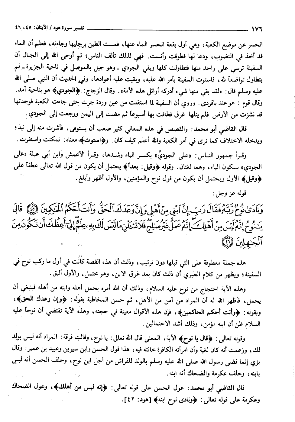 وَنادى نُوحٌ رَبَّهُ فَقالَ رَبِّ إِنَّ ابْنِي مِنْ أَهْلِي وَإِنَّ وَعْدَكَ الْحَقُّ وَأَنْتَ أَحْكَمُ الْحاكِمِينَ (٤٥) قالَ يا نُوحُ إِنَّهُ لَيْسَ مِنْ أَهْلِكَ إِنَّهُ عَمَلٌ غَيْرُ صالِحٍ فَلا تَسْئَلْنِ ما لَيْسَ لَكَ بِهِ عِلْمٌ إِنِّي أَعِظُكَ أَنْ تَكُونَ مِنَ الْجاهِلِينَ (٤٦)