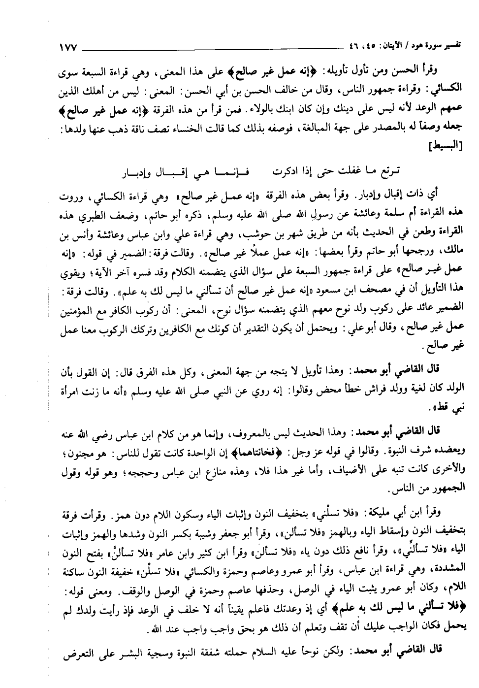 أي ذات إقبال وإدبار. وقرأ بعض هذه الفرقة «إنه عمل غير صالح» وهي قراءة الكسائي، وروت هذه القراءة أم سلمة وعائشة عن رسول الله صلى الله عليه وسلم، ذكره أبو حاتم، وضعف الطبري هذه القراءة وطعن في الحديث بأنه من طريق شهر بن حوشب، وهي قراءة علي وابن عباس وعائشة وأنس بن مالك، ورجحها أبو حاتم وقرأ بعضها: «إنه عمل عملا غير صالح» . وقالت فرقة: الضمير في قوله: «إنه عمل غير صالح» على قراءة جمهور السبعة على سؤال الذي يتضمنه الكلام وقد فسره آخر الآية ويقوي هذا التأويل أن في مصحف ابن مسعود «إنه عمل غير صالح أن تسألني ما ليس لك به علم» . وقالت فرقة: