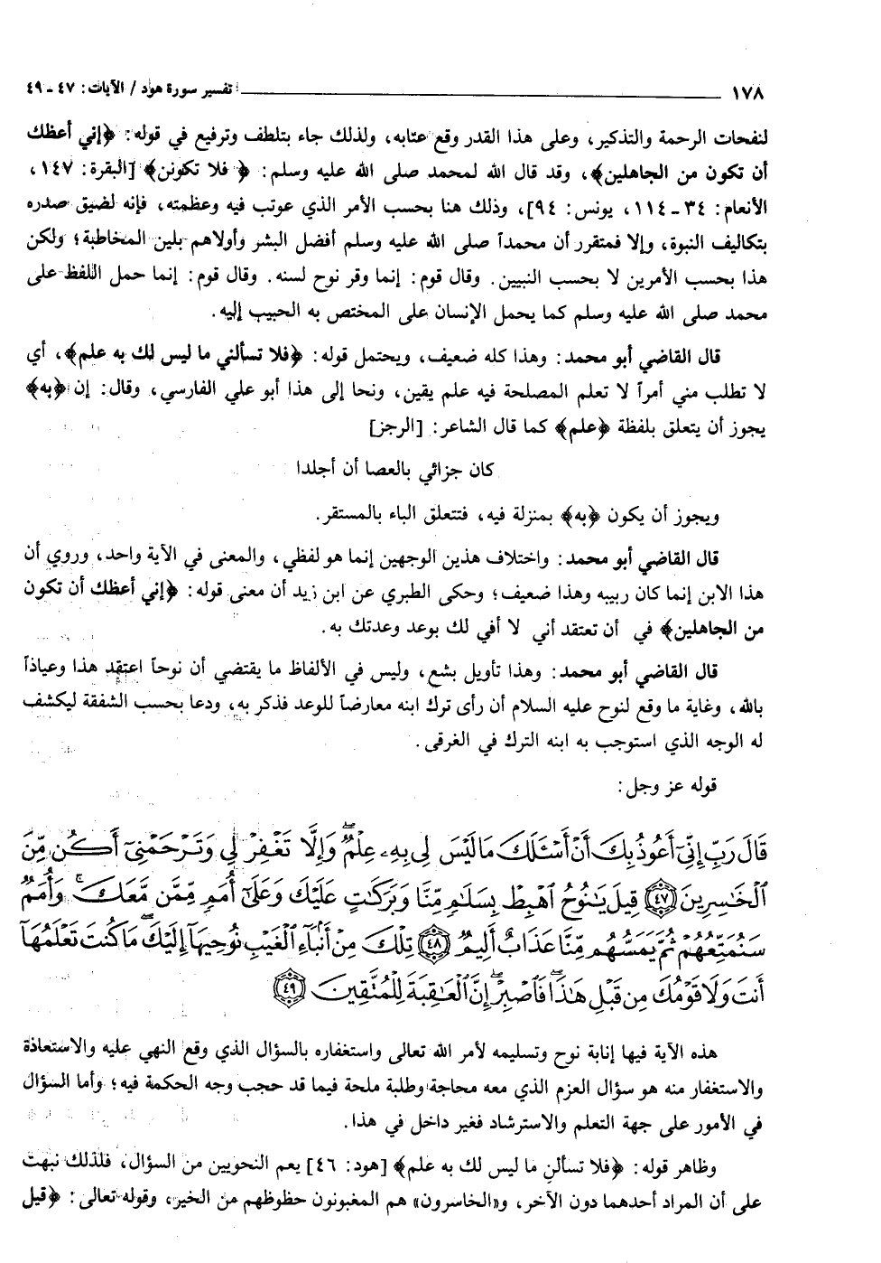 قالَ رَبِّ إِنِّي أَعُوذُ بِكَ أَنْ أَسْئَلَكَ ما لَيْسَ لِي بِهِ عِلْمٌ وَإِلاَّ تَغْفِرْ لِي وَتَرْحَمْنِي أَكُنْ مِنَ الْخاسِرِينَ (٤٧) قِيلَ يا نُوحُ اهْبِطْ بِسَلامٍ مِنَّا وَبَرَكاتٍ عَلَيْكَ وَعَلى أُمَمٍ مِمَّنْ مَعَكَ وَأُمَمٌ سَنُمَتِّعُهُمْ ثُمَّ يَمَسُّهُمْ مِنَّا عَذابٌ أَلِيمٌ (٤٨) تِلْكَ مِنْ أَنْباءِ الْغَيْبِ نُوحِيها إِلَيْكَ ما كُنْتَ تَعْلَمُها أَنْتَ وَلا قَوْمُكَ مِنْ قَبْلِ هذا فَاصْبِرْ إِنَّ الْعاقِبَةَ لِلْمُتَّقِينَ (٤٩)