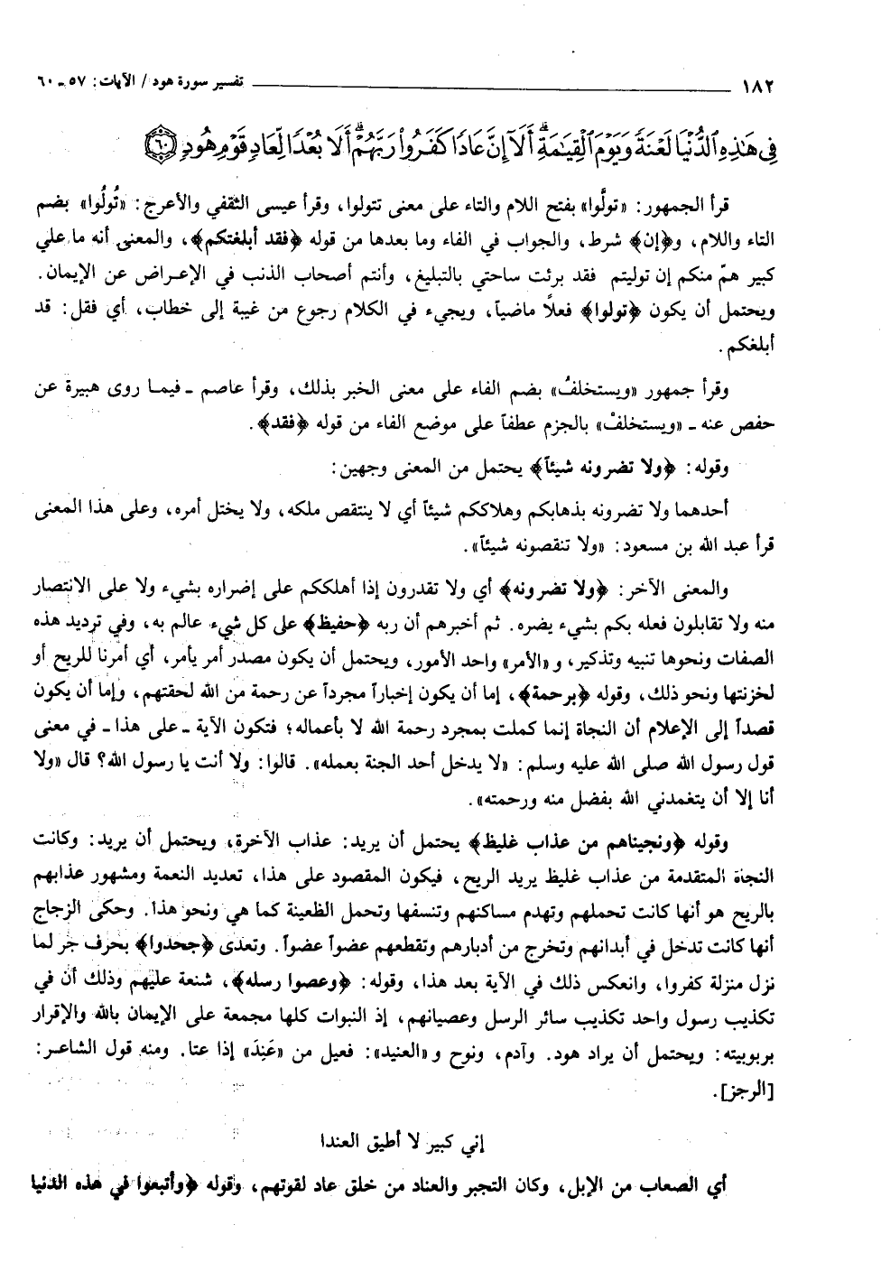 إني كبير لا أطيق العندا أي الصعاب من الإبل، وكان التجبر والعناد من خلق عاد لقوتهم، وقوله وَأُتْبِعُوا فِي هذِهِ الدُّنْيا