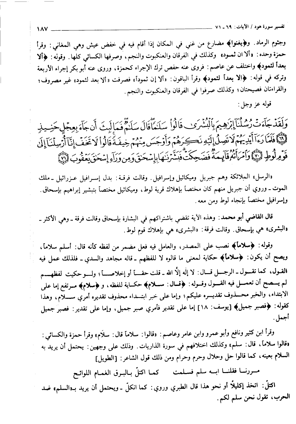«قالوا سلاما، قال: سلم» وكذلك اختلافهم في سورة الذاريات. وذلك على وجهين: يحتمل أن يريد به السّلام بعينه، كما قالوا حل وحلال وحرم وحرام ومن ذلك قول الشاعر: [الطويل]
