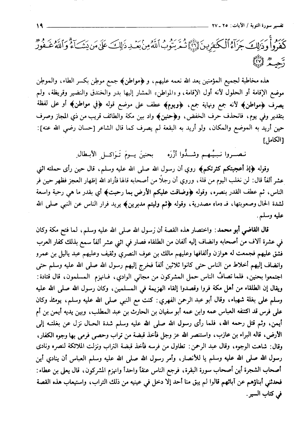 هذه مخاطبة لجميع المؤمنين يعد الله نعمه عليهم، ومَواطِنَ جمع موطن بكسر الطاء، والموطن موضع الإقامة أو الحلول لأنه أول الإقامة، و «المواطن» المشار إليها بدر والخندق والنضير وقريظة، ولم يصرف مَواطِنَ لأنه جمع ونهاية جمع، وَيَوْمَ عطف على موضع قوله فِي مَواطِنَ أو على لفظة بتقدير وفي يوم، فانحذف حرف الخفض، وحُنَيْنٍ واد بين مكة والطائف قريب من ذي المجاز وصرف حين أريد به الموضع والمكان، ولو أريد به البقعة لم يصرف كما قال الشاعر [حسان رضي الله عنه] :