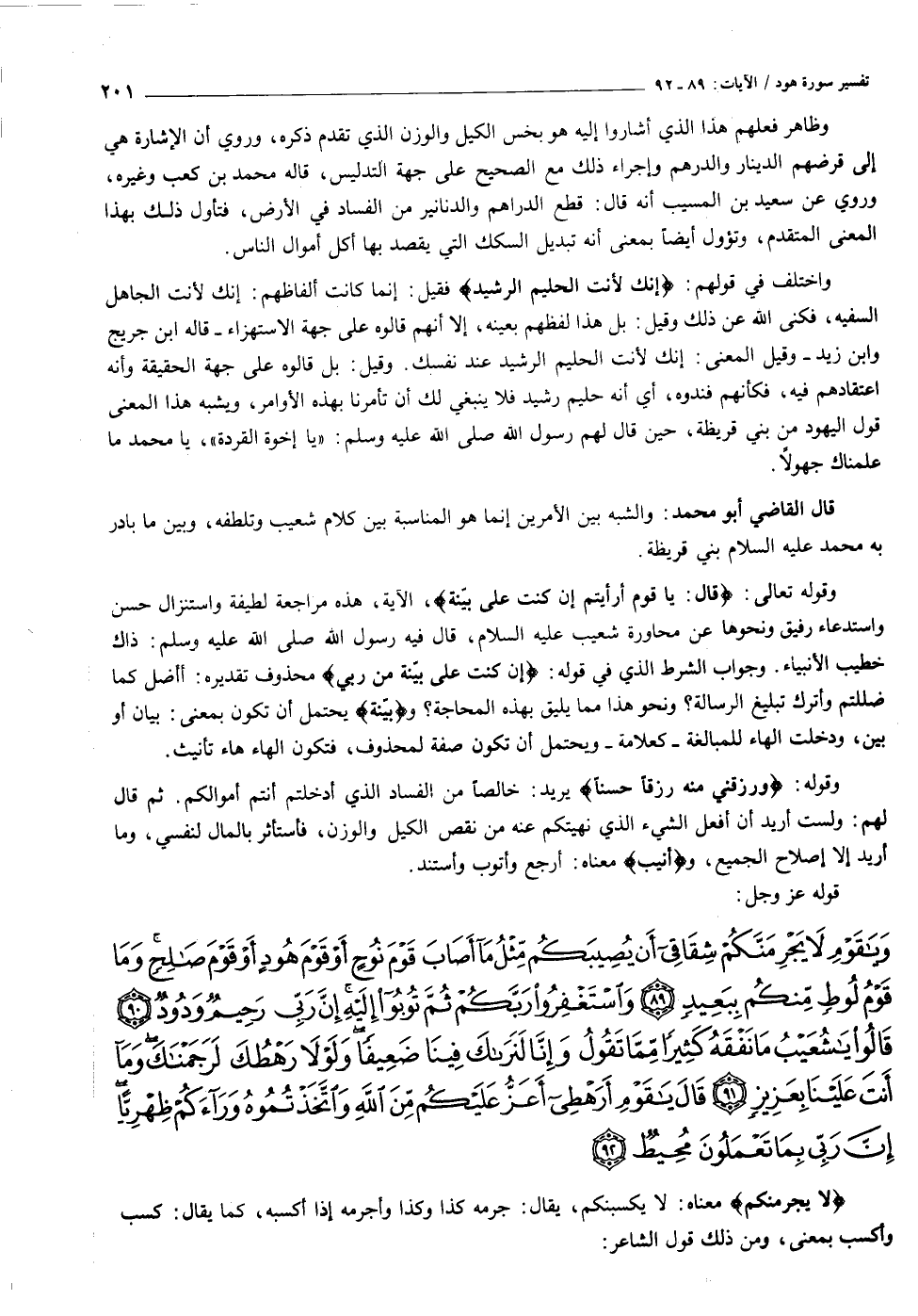 وَيا قَوْمِ لا يَجْرِمَنَّكُمْ شِقاقِي أَنْ يُصِيبَكُمْ مِثْلُ ما أَصابَ قَوْمَ نُوحٍ أَوْ قَوْمَ هُودٍ أَوْ قَوْمَ صالِحٍ وَما قَوْمُ لُوطٍ مِنْكُمْ بِبَعِيدٍ (٨٩) وَاسْتَغْفِرُوا رَبَّكُمْ ثُمَّ تُوبُوا إِلَيْهِ إِنَّ رَبِّي رَحِيمٌ وَدُودٌ (٩٠) قالُوا يا شُعَيْبُ ما نَفْقَهُ كَثِيراً مِمَّا تَقُولُ وَإِنَّا لَنَراكَ فِينا ضَعِيفاً وَلَوْلا رَهْطُكَ لَرَجَمْناكَ وَما أَنْتَ عَلَيْنا بِعَزِيزٍ (٩١) قالَ يا قَوْمِ أَرَهْطِي أَعَزُّ عَلَيْكُمْ مِنَ اللَّهِ وَاتَّخَذْتُمُوهُ وَراءَكُمْ ظِهْرِيًّا إِنَّ رَبِّي بِما تَعْمَلُونَ مُحِيطٌ (٩٢)