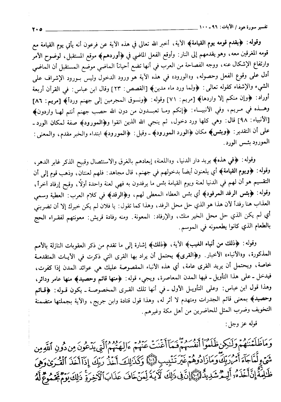 وقوله: يَقْدُمُ قَوْمَهُ يَوْمَ الْقِيامَةِ الآية، أخبر الله تعالى في هذه الآية عن فرعون أنه يأتي يوم القيامة مع قومه المغرقين معه، وهو يقدمهم إلى النار: وأوقع الفعل الماضي في فَأَوْرَدَهُمُ موقع المستقبل، لوضوح الأمر وارتفاع الإشكال عنه، ووجه الفصاحة من العرب في أنها تضع أحيانا الماضي موضع المستقبل أن الماضي أدل على وقوع الفعل وحصوله، و «الورود» في هذه الآية هو ورود الدخول وليس بورود الإشراف على الشيء والإشفاء كقوله تعالى: وَلَمَّا وَرَدَ ماءَ مَدْيَنَ [القصص: ٢٣] وقال ابن عباس: في القرآن أربعة أوراد: وَإِنْ مِنْكُمْ إِلَّا وارِدُها [مريم: ٧١] وقوله: وَنَسُوقُ الْمُجْرِمِينَ إِلى جَهَنَّمَ وِرْداً [مريم: ٨٦] وهذه في مريم، وفي الأنبياء: إِنَّكُمْ وَما تَعْبُدُونَ مِنْ دُونِ اللَّهِ حَصَبُ جَهَنَّمَ أَنْتُمْ لَها وارِدُونَ [الأنبياء: ٩٨] قال: وهي كلها ورد دخول، ثم ينجي الله الذين اتقوا والْمَوْرُودُ صفة لمكان الورد- على أن التقدير: وَبِئْسَ مكان الْوِرْدُ الْمَوْرُودُ- وقيل: الْمَوْرُودُ ابتداء والخبر مقدم، والمعنى: