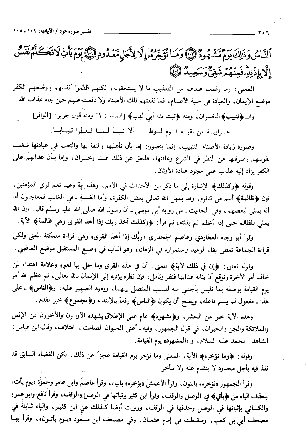 وقرأ الجمهور «نؤخره» بالنون، وقرأ الأعمش «يؤخره» بالياء، وقرأ عاصم وابن عامر وحمزة «يوم يأت» بحذف الياء من «يأتي» في الوصل والوقف، وقرأ ابن كثير بإثباتها في الوصل والوقف، وقرأ نافع وأبو عمرو والكسائي بإثباتها في الوصل وحذفها في الوقف، ورويت أيضا كذلك عن ابن كثير، والياء ثابتة في مصحف أبي بن كعب، وسقطت في إمام عثمان، وفي مصحف ابن مسعود «يوم يأتون» ، وقرأ بها