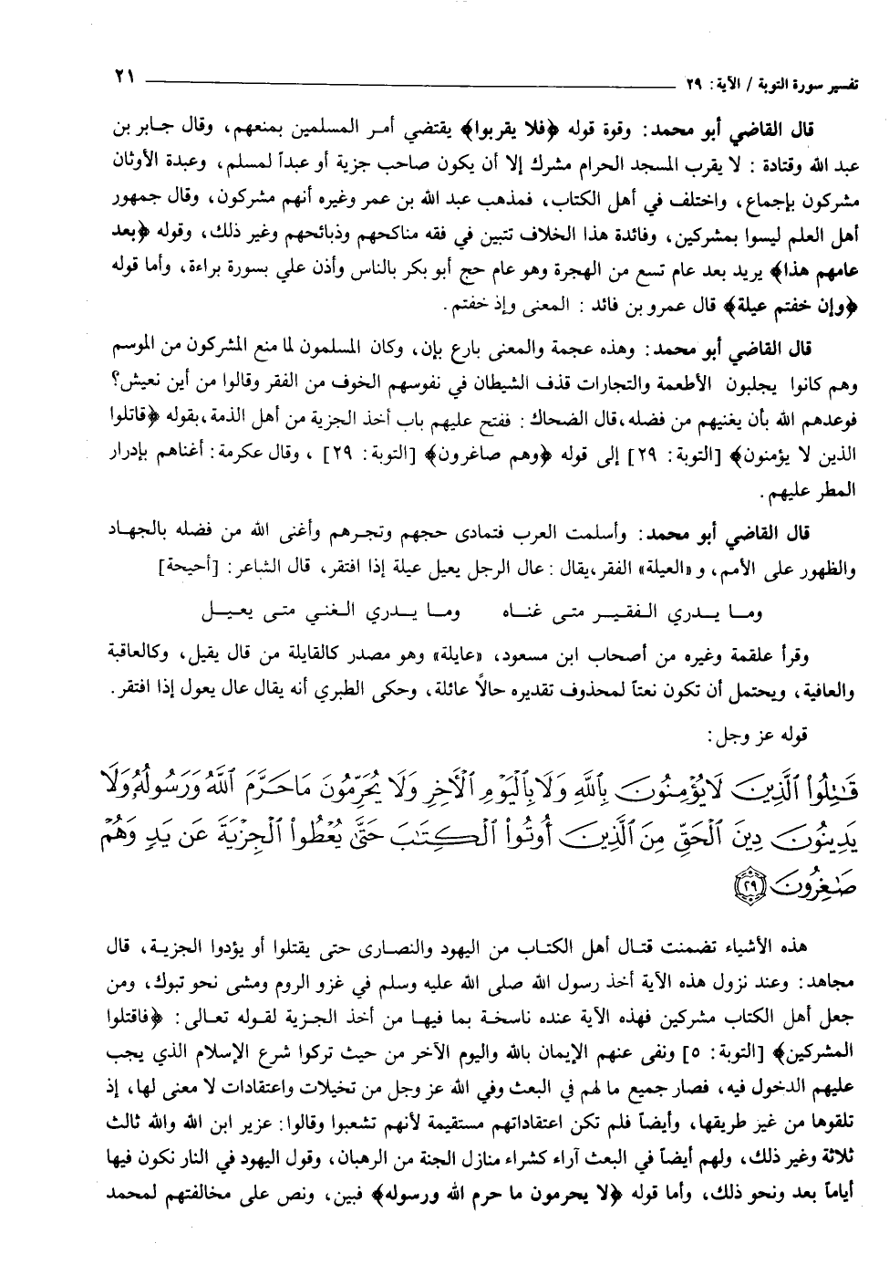قاتِلُوا الَّذِينَ لا يُؤْمِنُونَ بِاللَّهِ وَلا بِالْيَوْمِ الْآخِرِ وَلا يُحَرِّمُونَ ما حَرَّمَ اللَّهُ وَرَسُولُهُ وَلا يَدِينُونَ دِينَ الْحَقِّ مِنَ الَّذِينَ أُوتُوا الْكِتابَ حَتَّى يُعْطُوا الْجِزْيَةَ عَنْ يَدٍ وَهُمْ صاغِرُونَ (٢٩)