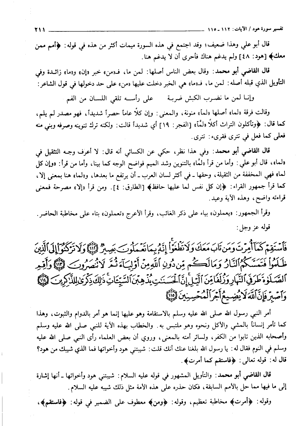 فَاسْتَقِمْ كَما أُمِرْتَ وَمَنْ تابَ مَعَكَ وَلا تَطْغَوْا إِنَّهُ بِما تَعْمَلُونَ بَصِيرٌ (١١٢) وَلا تَرْكَنُوا إِلَى الَّذِينَ ظَلَمُوا فَتَمَسَّكُمُ النَّارُ وَما لَكُمْ مِنْ دُونِ اللَّهِ مِنْ أَوْلِياءَ ثُمَّ لا تُنْصَرُونَ (١١٣) وَأَقِمِ الصَّلاةَ طَرَفَيِ النَّهارِ وَزُلَفاً مِنَ اللَّيْلِ إِنَّ الْحَسَناتِ يُذْهِبْنَ السَّيِّئاتِ ذلِكَ ذِكْرى لِلذَّاكِرِينَ (١١٤) وَاصْبِرْ فَإِنَّ اللَّهَ لا يُضِيعُ أَجْرَ الْمُحْسِنِينَ (١١٥)