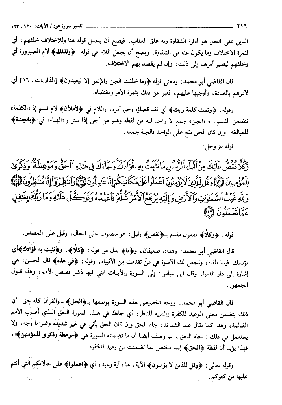 وَكُلاًّ نَقُصُّ عَلَيْكَ مِنْ أَنْباءِ الرُّسُلِ ما نُثَبِّتُ بِهِ فُؤادَكَ وَجاءَكَ فِي هذِهِ الْحَقُّ وَمَوْعِظَةٌ وَذِكْرى لِلْمُؤْمِنِينَ (١٢٠) وَقُلْ لِلَّذِينَ لا يُؤْمِنُونَ اعْمَلُوا عَلى مَكانَتِكُمْ إِنَّا عامِلُونَ (١٢١) وَانْتَظِرُوا إِنَّا مُنْتَظِرُونَ (١٢٢) وَلِلَّهِ غَيْبُ السَّماواتِ وَالْأَرْضِ وَإِلَيْهِ يُرْجَعُ الْأَمْرُ كُلُّهُ فَاعْبُدْهُ وَتَوَكَّلْ عَلَيْهِ وَما رَبُّكَ بِغافِلٍ عَمَّا تَعْمَلُونَ (١٢٣)