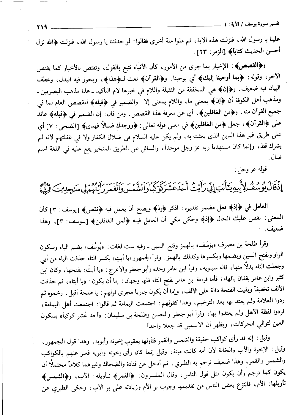 وقيل: إنه قد رأى كواكب حقيقة والشمس والقمر فتأولها يعقوب إخوته وأبويه، وهذا قول الجمهور، وقيل: الإخوة والأب والخالة لأن أمه كانت ميتة، وقيل إنما كان رأى إخوته وأبويه فعبر عنهم بالكواكب والشمس والقمر، وهذا ضعيف ترجم به الطبري، ثم أدخل عن قتادة والضحاك وغيرهما كلاما محتملا أن يكون كما ترجم وأن يكون مثل قول الناس، وقال المفسرون: الْقَمَرَ تأويله: الأب، والشَّمْسَ تأويلها: الأم، فانتزع بعض الناس من تقديمها وجوب بر الأم وزيادته على بر الأب، وحكى الطبري عن