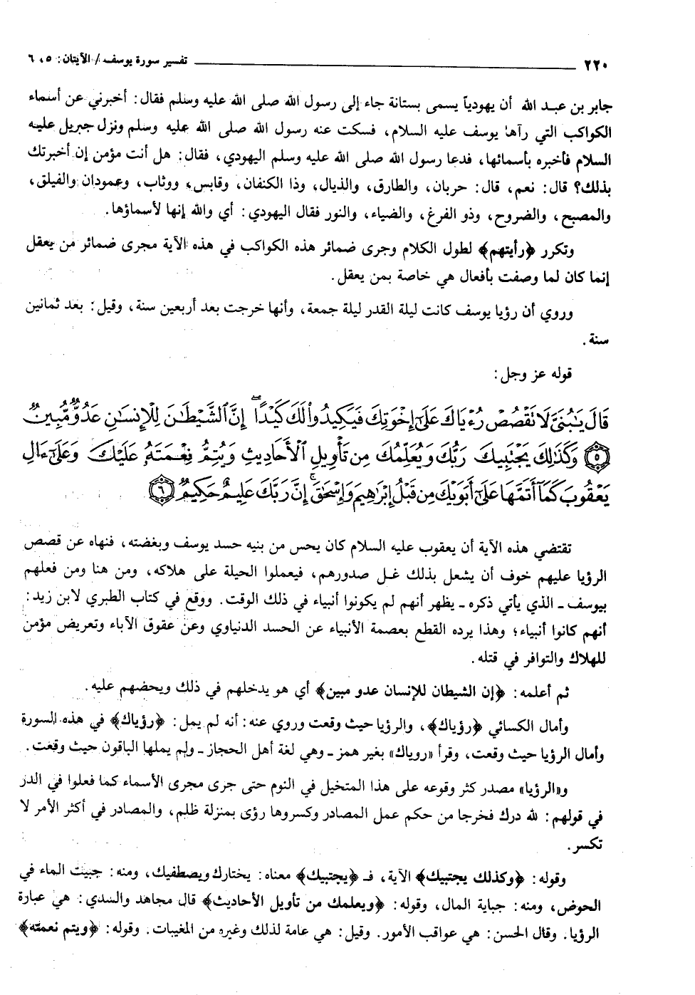 قالَ يا بُنَيَّ لا تَقْصُصْ رُؤْياكَ عَلى إِخْوَتِكَ فَيَكِيدُوا لَكَ كَيْداً إِنَّ الشَّيْطانَ لِلْإِنْسانِ عَدُوٌّ مُبِينٌ (٥) وَكَذلِكَ يَجْتَبِيكَ رَبُّكَ وَيُعَلِّمُكَ مِنْ تَأْوِيلِ الْأَحادِيثِ وَيُتِمُّ نِعْمَتَهُ عَلَيْكَ وَعَلى آلِ يَعْقُوبَ كَما أَتَمَّها عَلى أَبَوَيْكَ مِنْ قَبْلُ إِبْراهِيمَ وَإِسْحاقَ إِنَّ رَبَّكَ عَلِيمٌ حَكِيمٌ (٦)