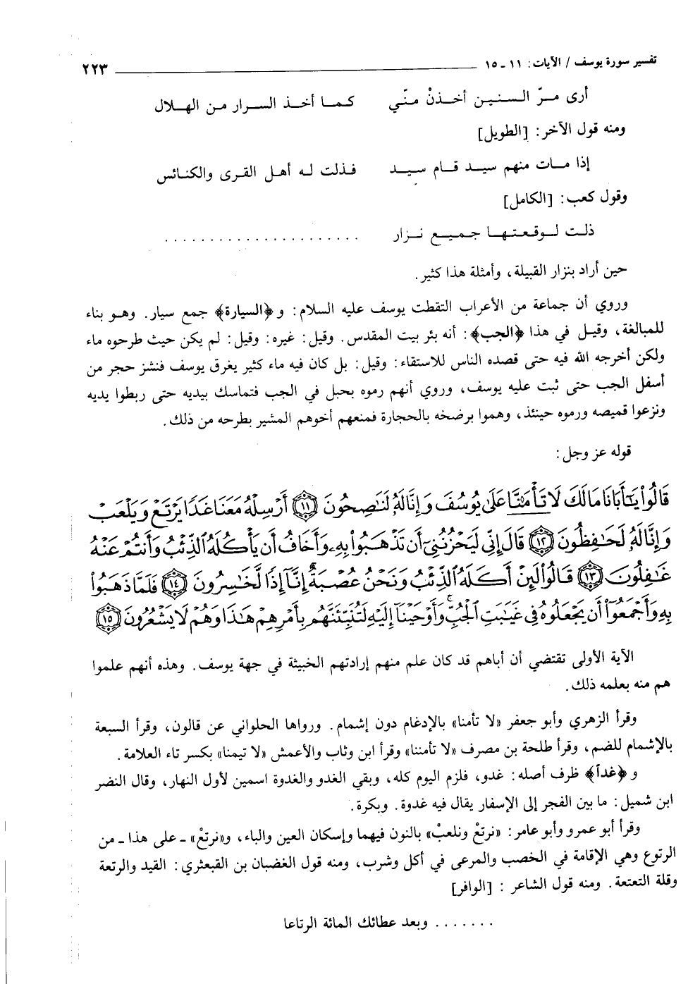 قالُوا يا أَبانا ما لَكَ لا تَأْمَنَّا عَلى يُوسُفَ وَإِنَّا لَهُ لَناصِحُونَ (١١) أَرْسِلْهُ مَعَنا غَداً يَرْتَعْ وَيَلْعَبْ وَإِنَّا لَهُ لَحافِظُونَ (١٢) قالَ إِنِّي لَيَحْزُنُنِي أَنْ تَذْهَبُوا بِهِ وَأَخافُ أَنْ يَأْكُلَهُ الذِّئْبُ وَأَنْتُمْ عَنْهُ غافِلُونَ (١٣) قالُوا لَئِنْ أَكَلَهُ الذِّئْبُ وَنَحْنُ عُصْبَةٌ إِنَّا إِذاً لَخاسِرُونَ (١٤) فَلَمَّا ذَهَبُوا بِهِ وَأَجْمَعُوا أَنْ يَجْعَلُوهُ فِي غَيابَتِ الْجُبِّ وَأَوْحَيْنا إِلَيْهِ لَتُنَبِّئَنَّهُمْ بِأَمْرِهِمْ هذا وَهُمْ لا يَشْعُرُونَ (١٥)