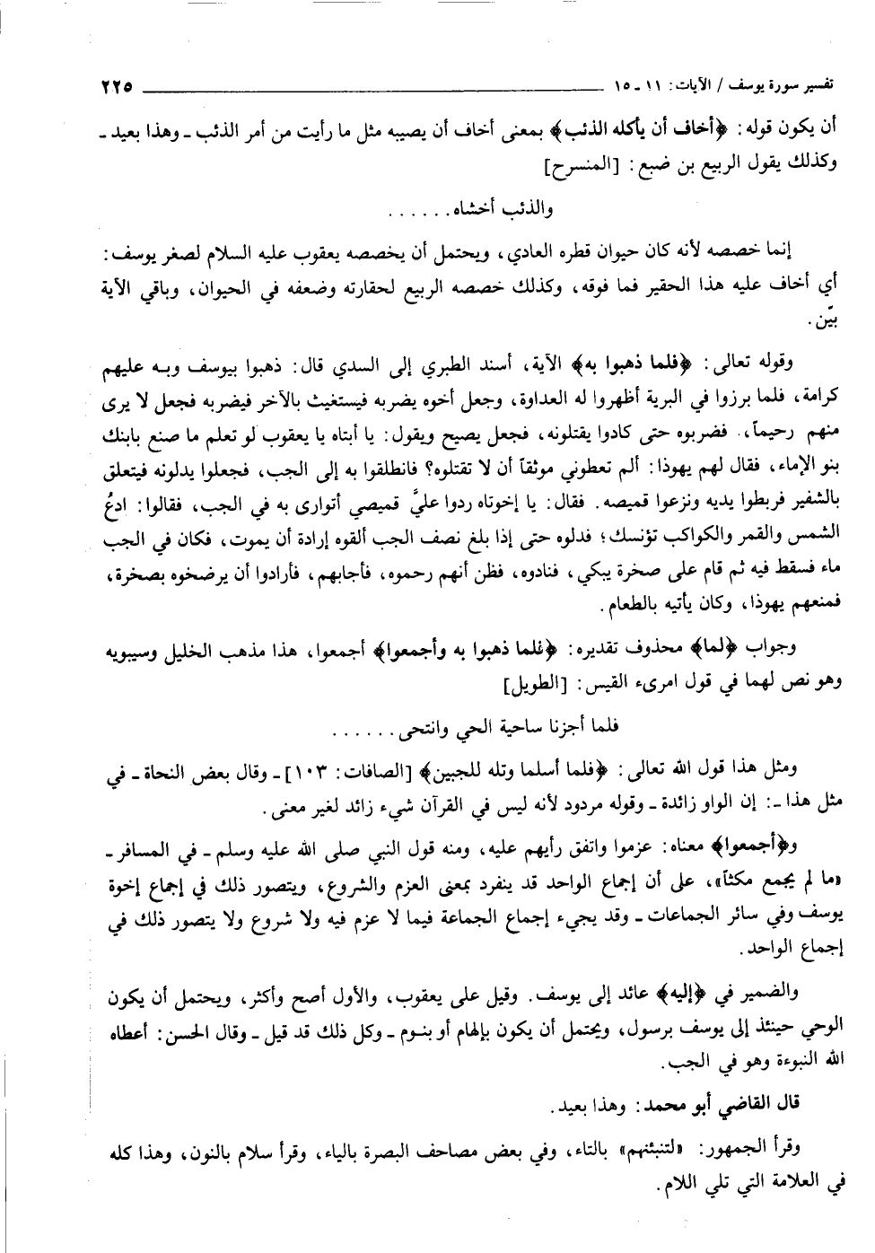 وقوله تعالى: فَلَمَّا ذَهَبُوا بِهِ الآية، أسند الطبري إلى السدي قال: ذهبوا بيوسف وبه عليهم كرامة، فلما برزوا في البرية أظهروا له العداوة، وجعل أخوه يضربه فيستغيث بالآخر فيضربه فجعل لا يرى منهم رحيما، فضربوه حتى كادوا يقتلونه، فجعل يصيح ويقول: يا أبتاه يا يعقوب لو تعلم ما صنع بابنك بنو الإماء، فقال لهم يهوذا: ألم تعطوني موثقا أن لا تقتلوه؟ فانطلقوا به إلى الجب، فجعلوا يدلونه فيتعلق بالشفير فربطوا يديه ونزعوا قميصه. فقال: يا إخوتاه ردوا عليّ قميصي أتوارى به في الجب، فقالوا: ادع الشمس والقمر والكواكب تؤنسك فدلوه حتى إذا بلغ نصف الجب ألقوه إرادة أن يموت، فكان في الجب ماء فسقط فيه ثم قام على صخرة يبكي، فنادوه، فظن أنهم رحموه، فأجابهم، فأرادوا أن يرضخوه بصخرة، فمنعهم يهوذا، وكان يأتيه بالطعام.