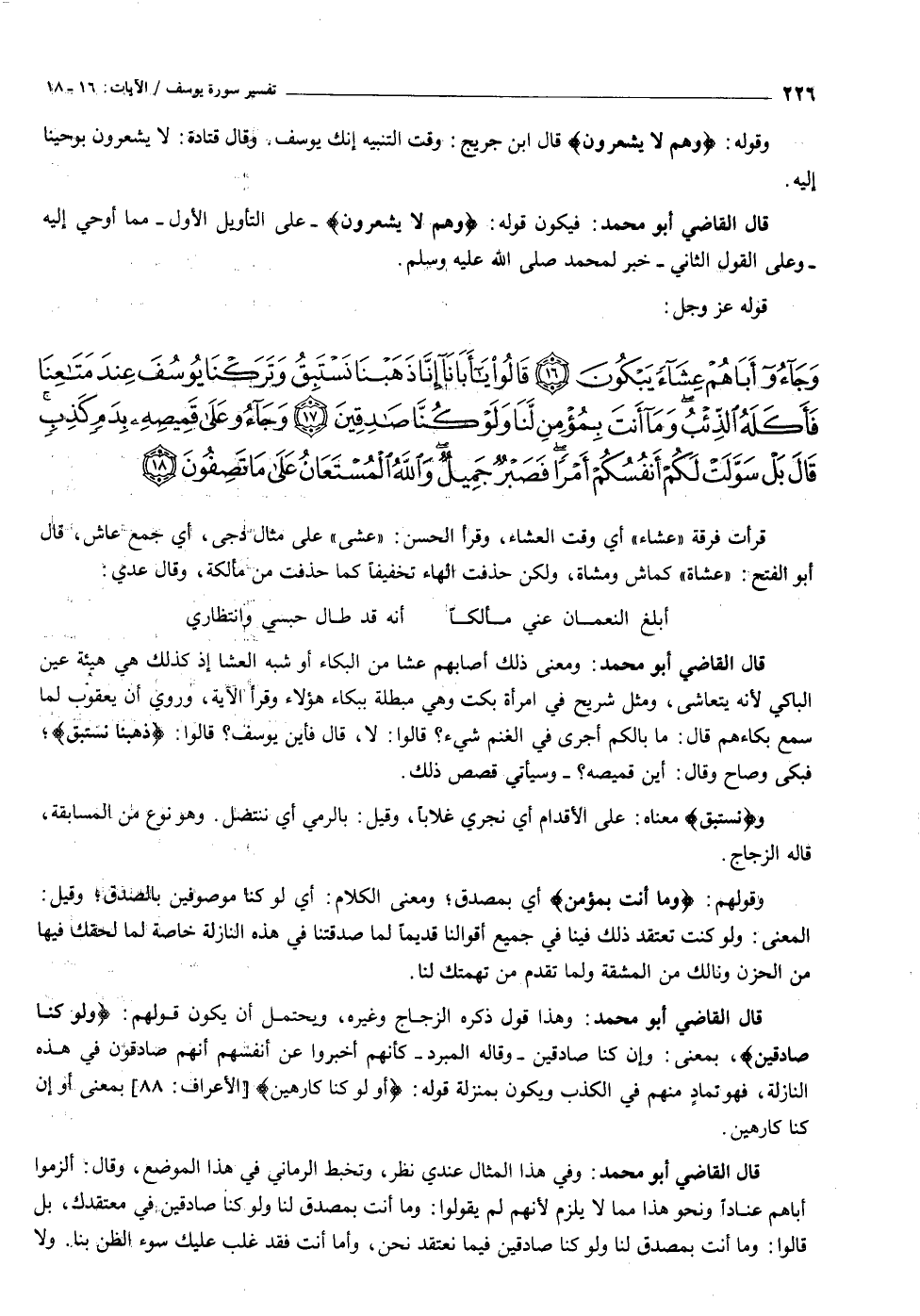 قال القاضي أبو محمد: ومعنى ذلك أصابهم عشا من البكاء أو شبه العشا إذ كذلك هي هيئة عين الباكي لأنه يتعاشى، ومثل شريح في امرأة بكت وهي مبطلة ببكاء هؤلاء وقرأ الآية، وروي أن يعقوب لما سمع بكاءهم قال: ما بالكم أجرى في الغنم شيء؟ قالوا: لا، قال فأين يوسف؟ قالوا: ذَهَبْنا نَسْتَبِقُ فبكى وصاح وقال: أين قميصه؟ - وسيأتي قصص ذلك.