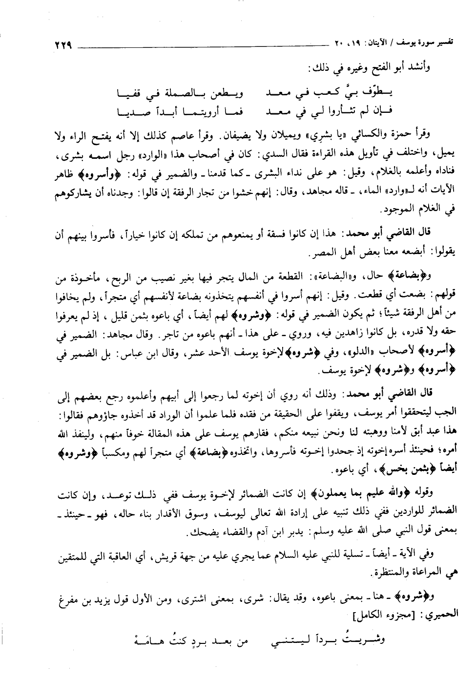 وقرأ حمزة والكسائي «يا بشري» ويميلان ولا يضيفان. وقرأ عاصم كذلك إلا أنه يفتح الراء ولا يميل، واختلف في تأويل هذه القراءة فقال السدي: كان في أصحاب هذا «الوارد» رجل اسمه بشرى، فناداه وأعلمه بالغلام، وقيل: هو على نداء البشرى- كما قدمنا- والضمير في قوله: وَأَسَرُّوهُ ظاهر الآيات أنه ل «وارد» الماء، - قاله مجاهد، وقال: إنهم خشوا من تجار الرفقة إن قالوا: وجدناه أن يشاركوهم في الغلام الموجود.