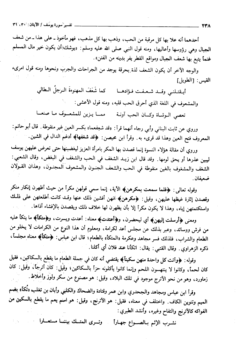 وروي أن مقالة هؤلاء النسوة إنما قصدن بها المكر بامرأة العزيز ليغضبنها حتى تعرض عليهن يوسف ليبين عذرها أو يحق لومها. وقد قال ابن زيد الشغف في الحب والشغف في البغض، وقال الشعبي: