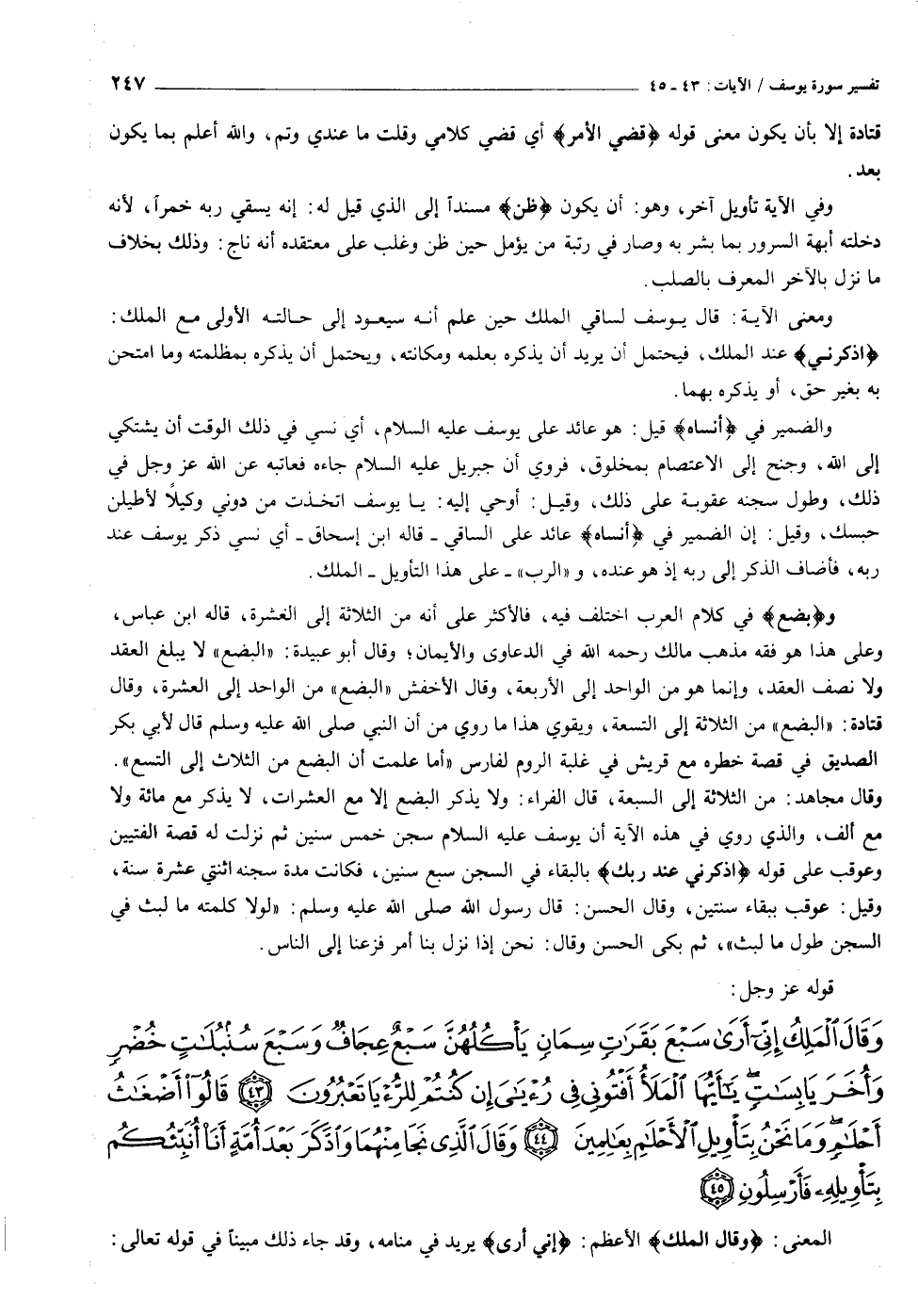 وَقالَ الْمَلِكُ إِنِّي أَرى سَبْعَ بَقَراتٍ سِمانٍ يَأْكُلُهُنَّ سَبْعٌ عِجافٌ وَسَبْعَ سُنْبُلاتٍ خُضْرٍ وَأُخَرَ يابِساتٍ يا أَيُّهَا الْمَلَأُ أَفْتُونِي فِي رُءْيايَ إِنْ كُنْتُمْ لِلرُّءْيا تَعْبُرُونَ (٤٣) قالُوا أَضْغاثُ أَحْلامٍ وَما نَحْنُ بِتَأْوِيلِ الْأَحْلامِ بِعالِمِينَ (٤٤) وَقالَ الَّذِي نَجا مِنْهُما وَادَّكَرَ بَعْدَ أُمَّةٍ أَنَا أُنَبِّئُكُمْ بِتَأْوِيلِهِ فَأَرْسِلُونِ (٤٥)