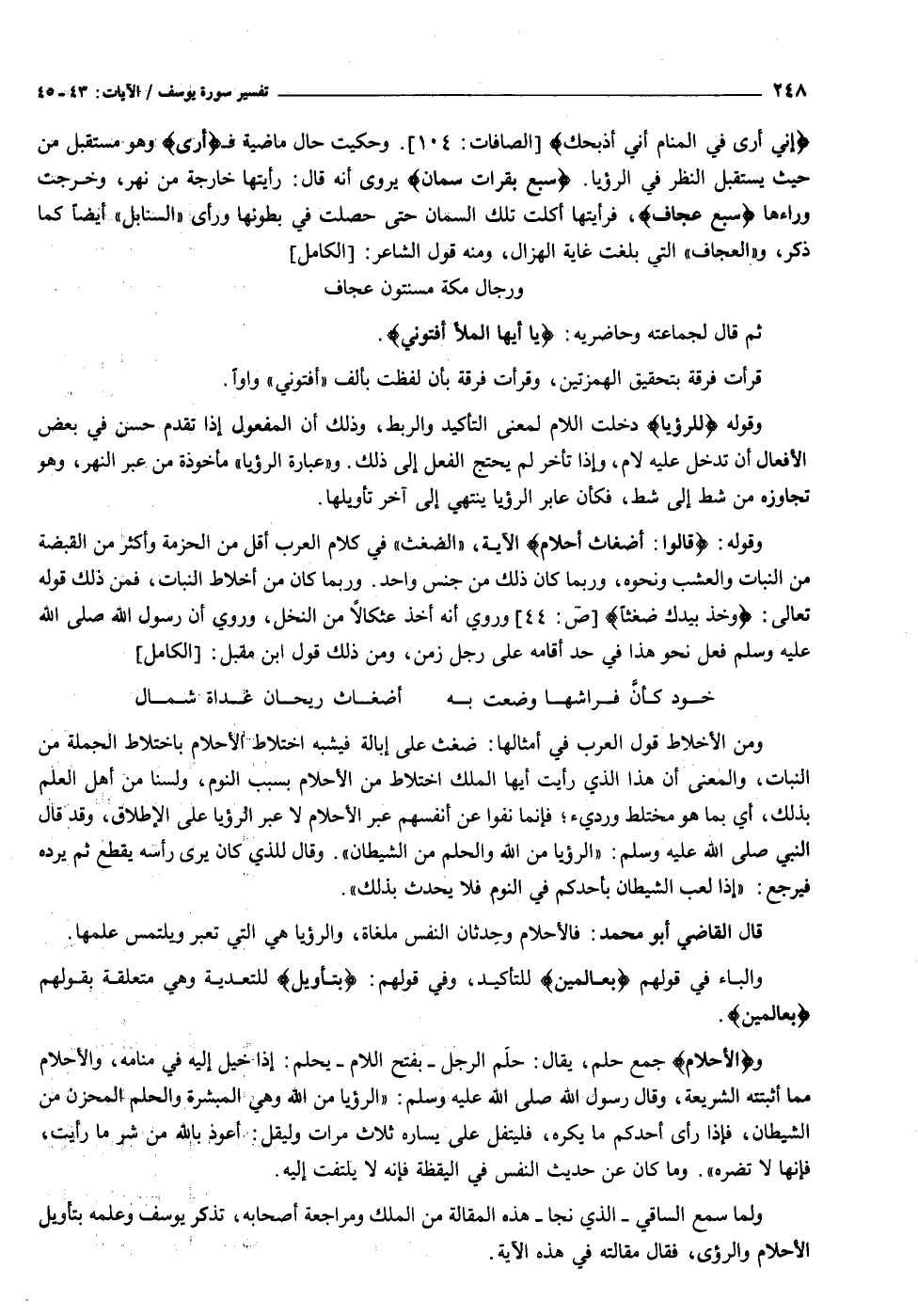 إِنِّي أَرى فِي الْمَنامِ أَنِّي أَذْبَحُكَ [الصافات: ١٠٤] . وحكيت حال ماضية ف أَرى وهو مستقبل من حيث يستقبل النظر في الرؤيا. سَبْعَ بَقَراتٍ سِمانٍ يروى أنه قال: رأيتها خارجة من نهر، وخرجت وراءها سَبْعٌ عِجافٌ، فرأيتها أكلت تلك السمان حتى حصلت في بطونها ورأى «السنابل» أيضا كما ذكر، و «العجاف» التي بلغت غاية الهزال، ومنه قول الشاعر: [الكامل] ورجال مكة مسنتون عجاف ثم قال لجماعته وحاضريه: يا أَيُّهَا الْمَلَأُ أَفْتُونِي.