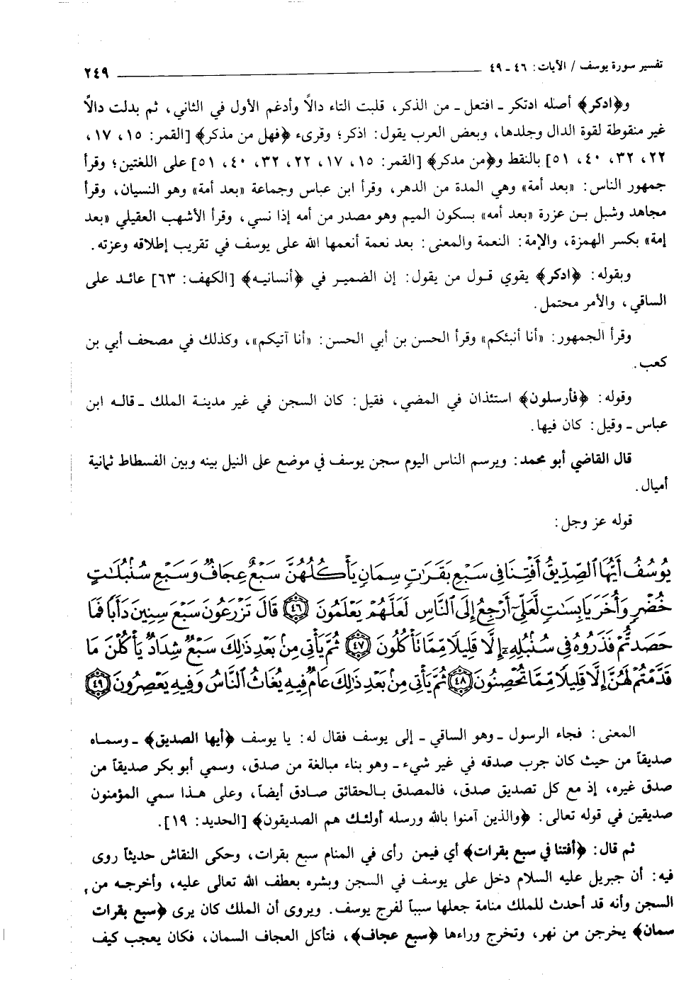 يُوسُفُ أَيُّهَا الصِّدِّيقُ أَفْتِنا فِي سَبْعِ بَقَراتٍ سِمانٍ يَأْكُلُهُنَّ سَبْعٌ عِجافٌ وَسَبْعِ سُنْبُلاتٍ خُضْرٍ وَأُخَرَ يابِساتٍ لَعَلِّي أَرْجِعُ إِلَى النَّاسِ لَعَلَّهُمْ يَعْلَمُونَ (٤٦) قالَ تَزْرَعُونَ سَبْعَ سِنِينَ دَأَباً فَما حَصَدْتُمْ فَذَرُوهُ فِي سُنْبُلِهِ إِلاَّ قَلِيلاً مِمَّا تَأْكُلُونَ (٤٧) ثُمَّ يَأْتِي مِنْ بَعْدِ ذلِكَ سَبْعٌ شِدادٌ يَأْكُلْنَ ما قَدَّمْتُمْ لَهُنَّ إِلاَّ قَلِيلاً مِمَّا تُحْصِنُونَ (٤٨) ثُمَّ يَأْتِي مِنْ بَعْدِ ذلِكَ عامٌ فِيهِ يُغاثُ النَّاسُ وَفِيهِ يَعْصِرُونَ (٤٩)