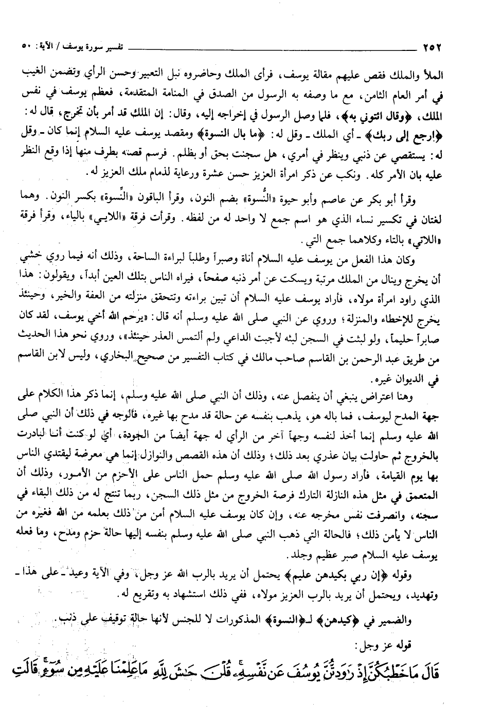 وكان هذا الفعل من يوسف عليه السلام أناة وصبرا وطلبا لبراءة الساحة، وذلك أنه فيما روي خشي أن يخرج وينال من الملك مرتبة ويسكت عن أمر ذنبه صفحا، فيراه الناس بتلك العين أبدا، ويقولون: هذا الذي راود امرأة مولاه، فأراد يوسف عليه السلام أن تبين براءته وتتحقق منزلته من العفة والخير، وحينئذ يخرج للإخطاء والمنزلة وروي عن النبي صلى الله عليه وسلم أنه قال: «يرحم الله أخي يوسف، لقد كان صابرا حليما، ولو لبثت في السجن لبثه لأجبت الداعي ولم ألتمس العذر حينئذ» ، وروي نحو هذا الحديث من طريق عبد الرحمن بن القاسم صاحب مالك في كتاب التفسير من صحيح البخاري، وليس لابن القاسم في الديوان غيره.