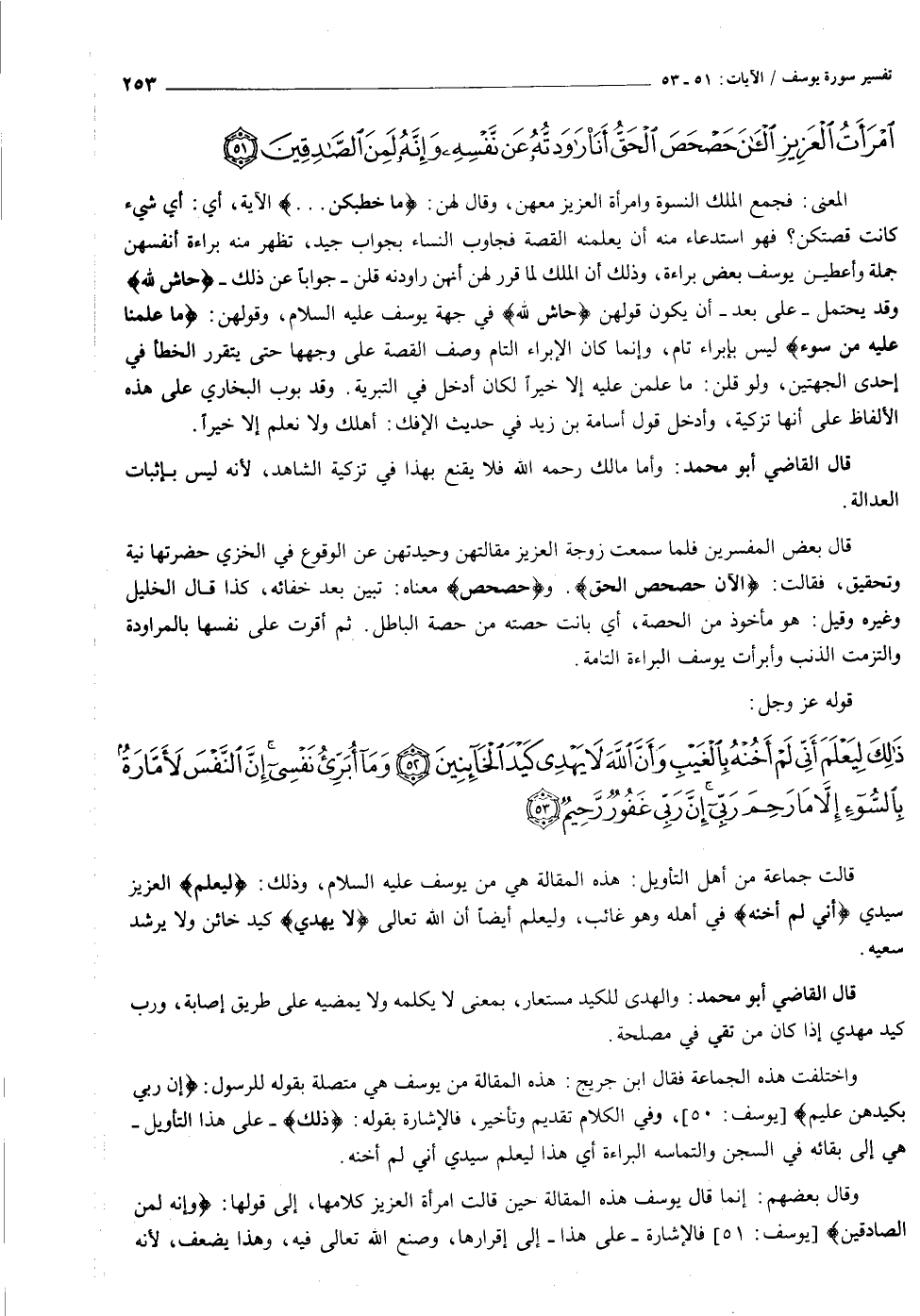قالَ ما خَطْبُكُنَّ إِذْ راوَدْتُنَّ يُوسُفَ عَنْ نَفْسِهِ قُلْنَ حاشَ لِلَّهِ ما عَلِمْنا عَلَيْهِ مِنْ سُوءٍ قالَتِ امْرَأَةُ الْعَزِيزِ الْآنَ حَصْحَصَ الْحَقُّ أَنَا راوَدْتُهُ عَنْ نَفْسِهِ وَإِنَّهُ لَمِنَ الصَّادِقِينَ (٥١)