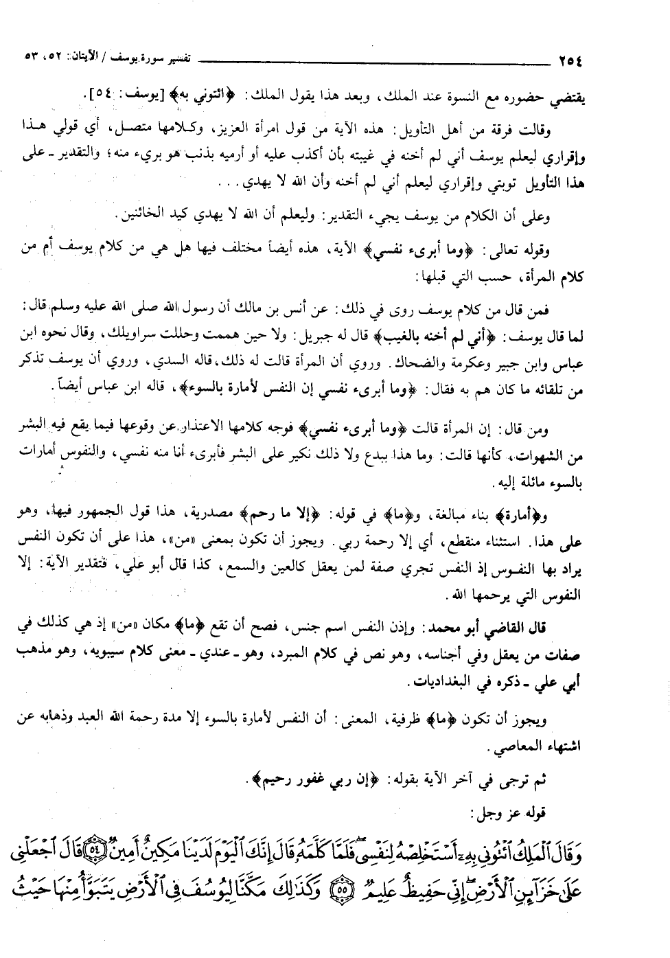وقوله تعالى: وَما أُبَرِّئُ نَفْسِي الآية، هذه أيضا مختلف فيها هل هي من كلام يوسف أم من كلام المرأة، حسب التي قبلها:
