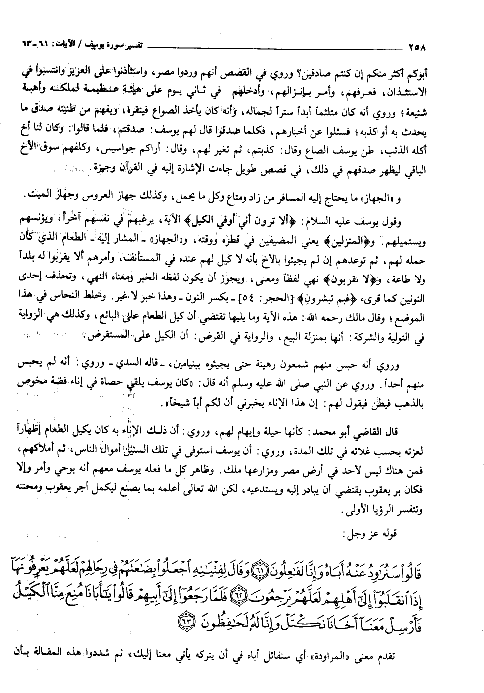 وقول يوسف عليه السلام: أَلا تَرَوْنَ أَنِّي أُوفِي الْكَيْلَ الآية، يرغبهم في نفسهم آخرا، ويؤنسهم ويستميلهم. والْمُنْزِلِينَ يعني المضيفين في قطره ووقته، و «الجهاز» - المشار إليه- الطعام الذي كان حمله لهم، ثم توعدهم إن لم يجيئوا بالأخ بأنه لا كيل لهم عنده في المستأنف، وأمرهم ألا يقربوا له بلدا ولا طاعة، ولا تَقْرَبُونِ نهي لفظا ومعنى، ويجوز أن يكون لفظه الخبر ومعناه النهي، وتحذف إحدى النونين كما قرىء فَبِمَ تُبَشِّرُونَ [الحجر: ٥٤]- بكسر النون- وهذا خبر لا غير. وخلط النحاس في هذا الموضع وقال مالك رحمه الله: هذه الآية وما يليها تقتضي أن كيل الطعام على البائع، وكذلك هي الرواية في التولية والشركة: أنها بمنزلة البيع، والرواية في القرض: أن الكيل على المستقرض.
