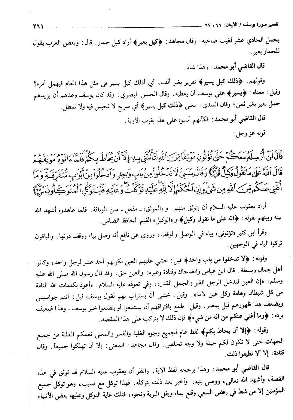 قالَ لَنْ أُرْسِلَهُ مَعَكُمْ حَتَّى تُؤْتُونِ مَوْثِقاً مِنَ اللَّهِ لَتَأْتُنَّنِي بِهِ إِلاَّ أَنْ يُحاطَ بِكُمْ فَلَمَّا آتَوْهُ مَوْثِقَهُمْ قالَ اللَّهُ عَلى ما نَقُولُ وَكِيلٌ (٦٦) وَقالَ يا بَنِيَّ لا تَدْخُلُوا مِنْ بابٍ واحِدٍ وَادْخُلُوا مِنْ أَبْوابٍ مُتَفَرِّقَةٍ وَما أُغْنِي عَنْكُمْ مِنَ اللَّهِ مِنْ شَيْءٍ إِنِ الْحُكْمُ إِلاَّ لِلَّهِ عَلَيْهِ تَوَكَّلْتُ وَعَلَيْهِ فَلْيَتَوَكَّلِ الْمُتَوَكِّلُونَ (٦٧)