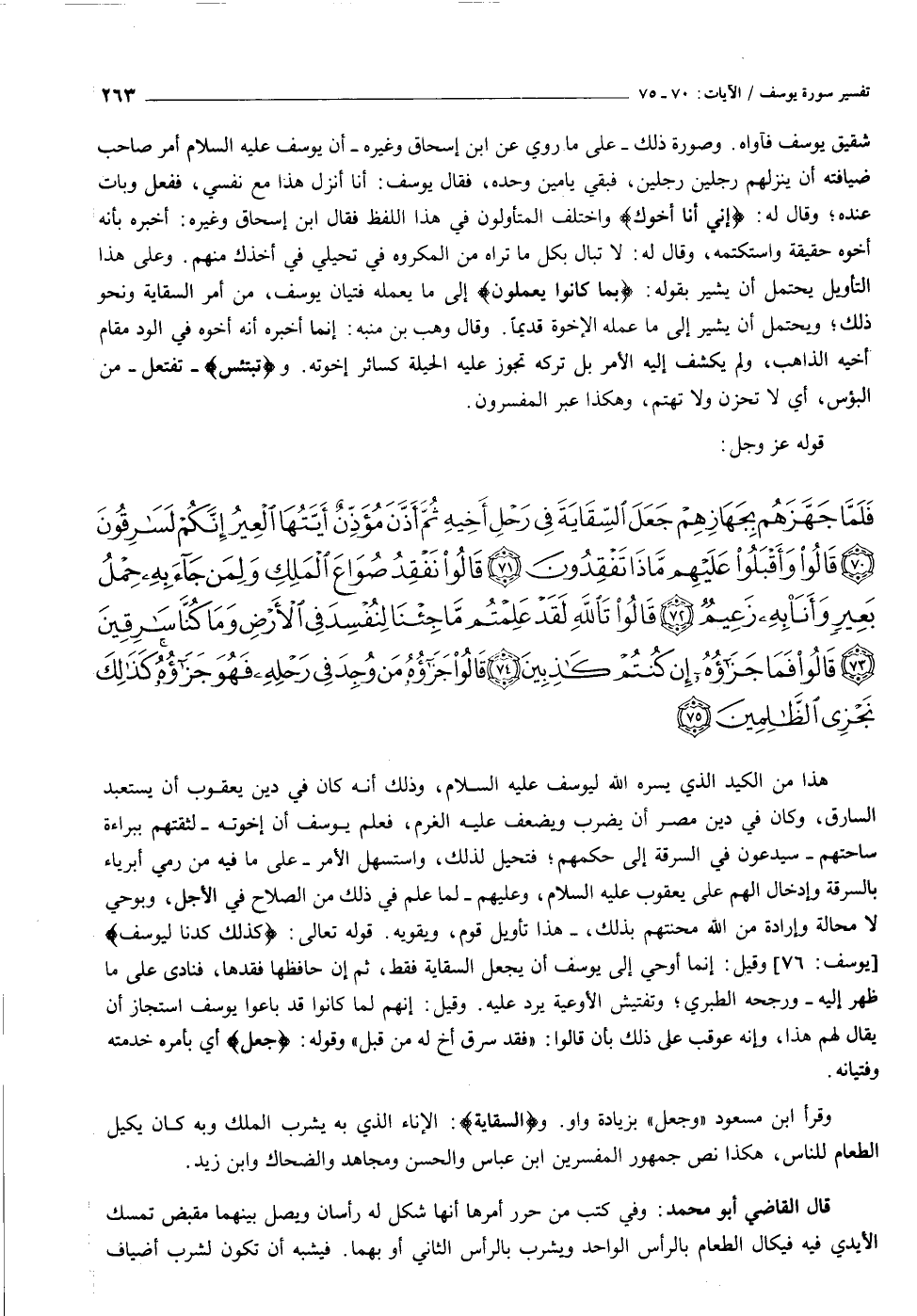 فَلَمَّا جَهَّزَهُمْ بِجَهازِهِمْ جَعَلَ السِّقايَةَ فِي رَحْلِ أَخِيهِ ثُمَّ أَذَّنَ مُؤَذِّنٌ أَيَّتُهَا الْعِيرُ إِنَّكُمْ لَسارِقُونَ (٧٠) قالُوا وَأَقْبَلُوا عَلَيْهِمْ ماذا تَفْقِدُونَ (٧١) قالُوا نَفْقِدُ صُواعَ الْمَلِكِ وَلِمَنْ جاءَ بِهِ حِمْلُ بَعِيرٍ وَأَنَا بِهِ زَعِيمٌ (٧٢) قالُوا تَاللَّهِ لَقَدْ عَلِمْتُمْ ما جِئْنا لِنُفْسِدَ فِي الْأَرْضِ وَما كُنَّا سارِقِينَ (٧٣) قالُوا فَما جَزاؤُهُ إِنْ كُنْتُمْ كاذِبِينَ (٧٤)
