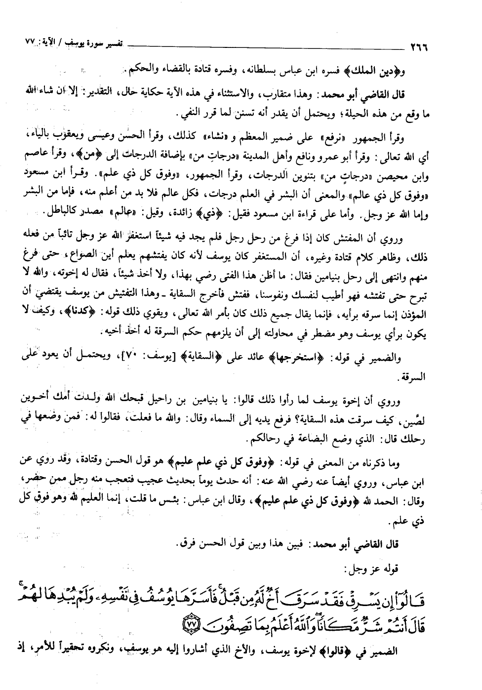 وقرأ الجمهور «نرفع» على ضمير المعظم و «نشاء» كذلك، وقرأ الحسن وعيسى ويعقوب بالياء، أي الله تعالى: «وقرأ أبو عمرو ونافع وأهل المدينة «درجات من» بإضافة الدرجات إلى مَنْ، وقرأ عاصم وابن محيصن «درجات من» بتنوين» الدرجات، وقرأ الجمهور، «وفوق كل ذي علم» . وقرأ ابن مسعود «وفوق كل ذي عالم» والمعنى أن البشر في العلم درجات، فكل عالم فلا بد من أعلم منه، فإما من البشر وإما الله عز وجل. وأما على قراءة ابن مسعود فقيل: ذِي زائدة، وقيل: «عالم» مصدر كالباطل.