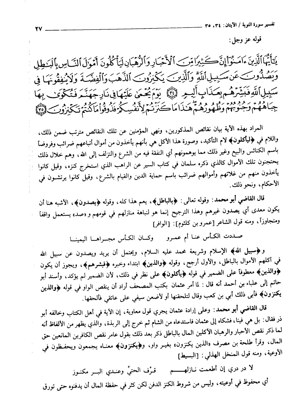 يا أَيُّهَا الَّذِينَ آمَنُوا إِنَّ كَثِيراً مِنَ الْأَحْبارِ وَالرُّهْبانِ لَيَأْكُلُونَ أَمْوالَ النَّاسِ بِالْباطِلِ وَيَصُدُّونَ عَنْ سَبِيلِ اللَّهِ وَالَّذِينَ يَكْنِزُونَ الذَّهَبَ وَالْفِضَّةَ وَلا يُنْفِقُونَها فِي سَبِيلِ اللَّهِ فَبَشِّرْهُمْ بِعَذابٍ أَلِيمٍ (٣٤) يَوْمَ يُحْمى عَلَيْها فِي نارِ جَهَنَّمَ فَتُكْوى بِها جِباهُهُمْ وَجُنُوبُهُمْ وَظُهُورُهُمْ هذا ما كَنَزْتُمْ لِأَنْفُسِكُمْ فَذُوقُوا ما كُنْتُمْ تَكْنِزُونَ (٣٥)