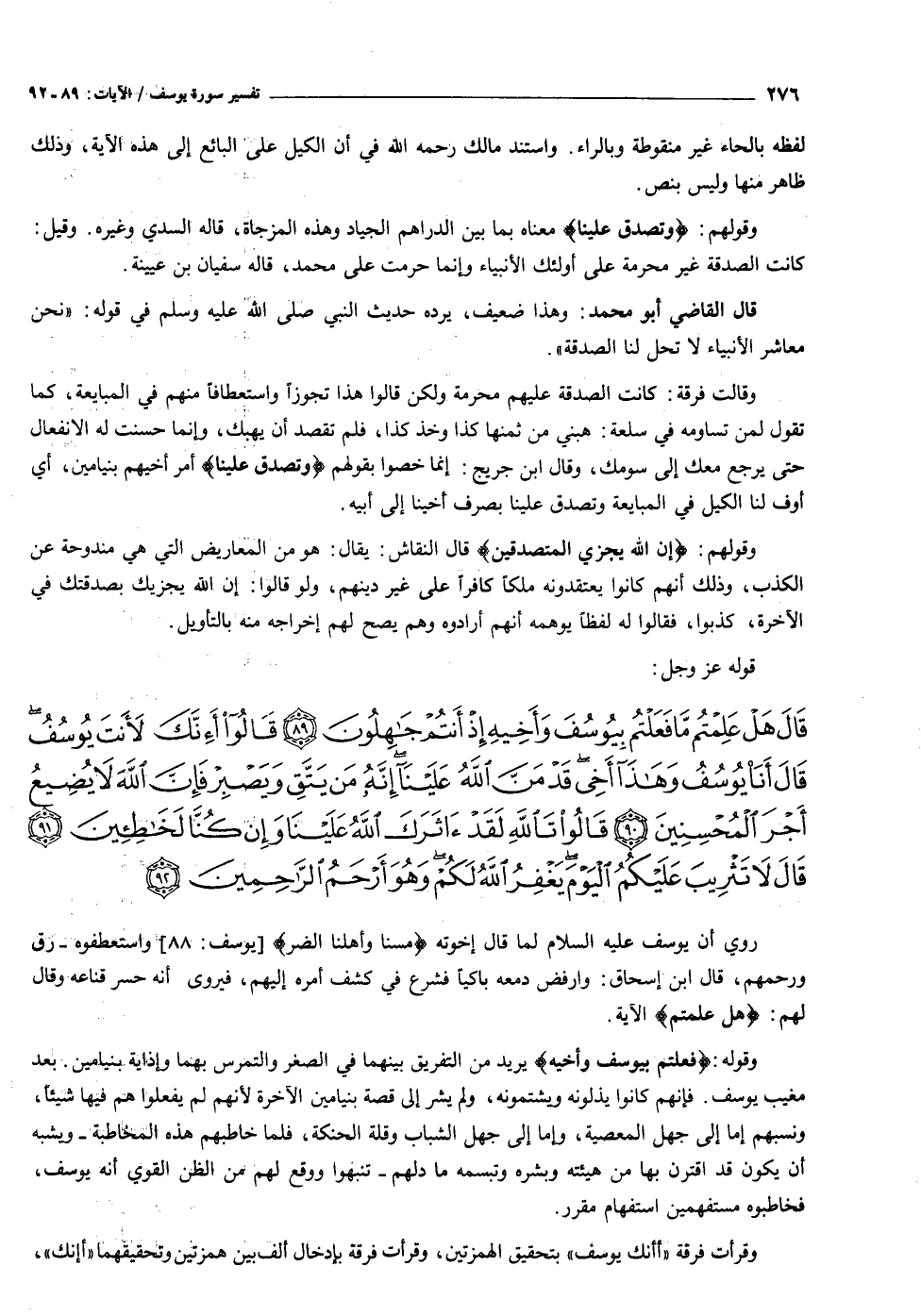 قالَ هَلْ عَلِمْتُمْ ما فَعَلْتُمْ بِيُوسُفَ وَأَخِيهِ إِذْ أَنْتُمْ جاهِلُونَ (٨٩) قالُوا أَإِنَّكَ لَأَنْتَ يُوسُفُ قالَ أَنَا يُوسُفُ وَهذا أَخِي قَدْ مَنَّ اللَّهُ عَلَيْنا إِنَّهُ مَنْ يَتَّقِ وَيَصْبِرْ فَإِنَّ اللَّهَ لا يُضِيعُ أَجْرَ الْمُحْسِنِينَ (٩٠) قالُوا تَاللَّهِ لَقَدْ آثَرَكَ اللَّهُ عَلَيْنا وَإِنْ كُنَّا لَخاطِئِينَ (٩١) قالَ لا تَثْرِيبَ عَلَيْكُمُ الْيَوْمَ يَغْفِرُ اللَّهُ لَكُمْ وَهُوَ أَرْحَمُ الرَّاحِمِينَ (٩٢)