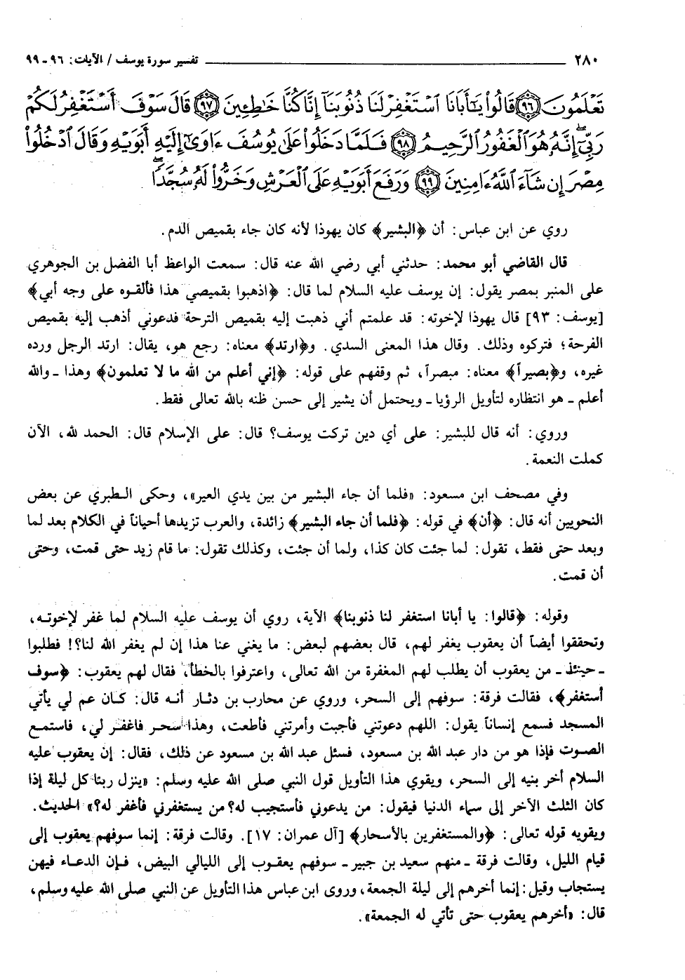 وقوله: قالُوا: يا أَبانَا اسْتَغْفِرْ لَنا ذُنُوبَنا الآية، روي أن يوسف عليه السلام لما غفر لإخوته، وتحققوا أيضا أن يعقوب يغفر لهم، قال بعضهم لبعض: ما يغني عنا هذا إن لم يغفر الله لنا؟! فطلبوا- حينئذ- من يعقوب أن يطلب لهم المغفرة من الله تعالى، واعترفوا بالخطأ، فقال لهم يعقوب: سَوْفَ أَسْتَغْفِرُ، فقالت فرقة: سوفهم إلى السحر، وروي عن محارب بن دثار أنه قال: كان عم لي يأتي المسجد فسمع إنسانا يقول: اللهم دعوتني فأجبت وأمرتني فأطعت، وهذا سحر فاغفر لي، فاستمع الصوت فإذا هو من دار عبد الله بن مسعود، فسئل عبد الله بن مسعود عن ذلك، فقال: إن يعقوب عليه السلام أخر بنيه إلى السحر، ويقوي هذا التأويل قول النبي صلى الله عليه وسلم: «ينزل ربنا كل ليلة إذا كان الثلث الآخر إلى سماء الدنيا فيقول: من يدعوني فأستجيب له؟ من يستغفرني فأغفر له؟» الحديث.