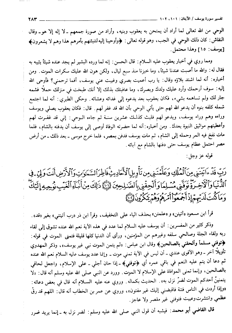 تَوَفَّنِي مُسْلِماً وَأَلْحِقْنِي بِالصَّالِحِينَ وقال ابن عباس: «لم يتمن الموت نبي غير يوسف» ، وذكر المهدوي تأويلا آخر- وهو الأقوى عندي- أن ليس في الآية تمني موت- وإنما عدد يوسف عليه السلام نعم الله عنده ثم دعا أن يتم عليه النعم في باقي عمره أي تَوَفَّنِي- إذا حان أجلي- على الإسلام، واجعل لحاقي بالصالحين، وإنما تمنى الموافاة على الإسلام لا الموت. وورد عن النبي صلى الله عليه وسلم أنه قال: «لا يتمنينّ أحدكم الموت لضرّ نزل به» . الحديث بكماله. وروي عنه عليه السلام أنه قال في بعض دعائه: