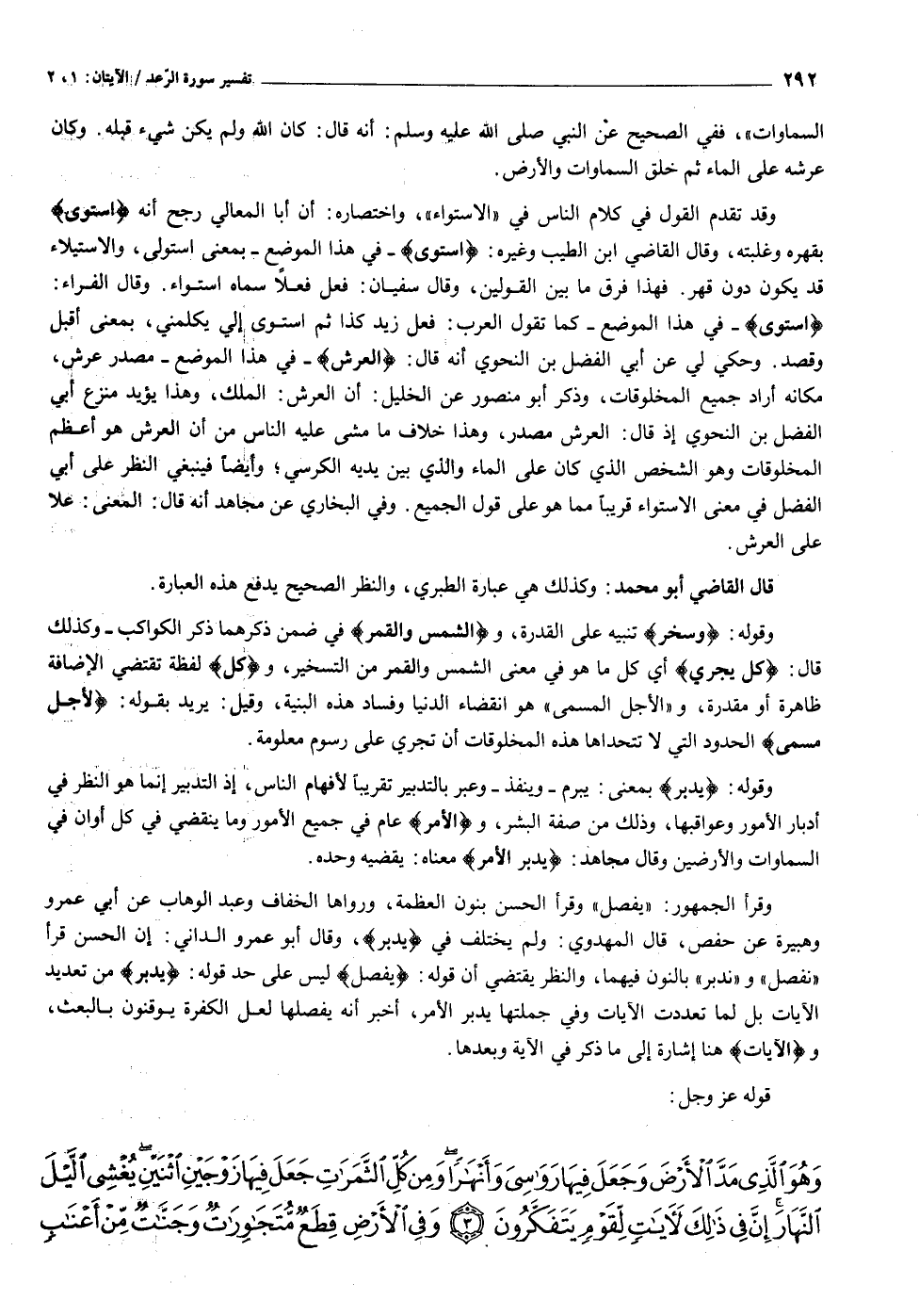 اسْتَوى - في هذا الموضع- كما تقول العرب: فعل زيد كذا ثم استوى إلي يكلمني، بمعنى أقبل وقصد. وحكي لي عن أبي الفضل بن النحوي أنه قال: الْعَرْشِ- في هذا الموضع- مصدر عرش، مكانه أراد جميع المخلوقات، وذكر أبو منصور عن الخليل: أن العرش: الملك، وهذا يؤيد منزع أبي الفضل بن النحوي إذ قال: العرش مصدر، وهذا خلاف ما مشى عليه الناس من أن العرش هو أعظم المخلوقات وهو الشخص الذي كان على الماء والذي بين يديه الكرسي وأيضا فينبغي النظر على أبي الفضل في معنى الاستواء قريبا مما هو على قول الجميع. وفي البخاري عن مجاهد أنه قال: المعنى: علا على العرش.