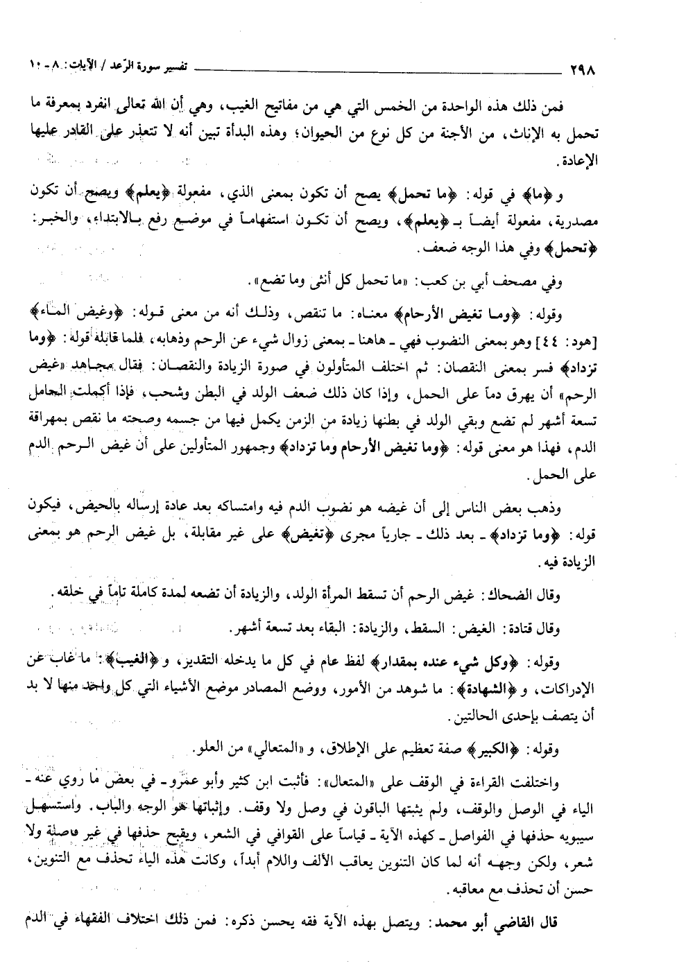 وقوله: وَما تَغِيضُ الْأَرْحامُ معناه: ما تنقص، وذلك أنه من معنى قوله: وَغِيضَ الْماءُ [هود: ٤٤] وهو بمعنى النضوب فهي- هاهنا- بمعنى زوال شيء عن الرحم وذهابه، فلما قابله قوله: وَما تَزْدادُ فسر بمعنى النقصان: ثم اختلف المتأولون في صورة الزيادة والنقصان: فقال مجاهد «غيض الرحم» أن يهرق دما على الحمل، وإذا كان ذلك ضعف الولد في البطن وشحب، فإذا أكملت الحامل تسعة أشهر لم تضع وبقي الولد في بطنها زيادة من الزمن يكمل فيها من جسمه وصحته ما نقص بمهراقة الدم، فهذا هو معنى قوله: وَما تَغِيضُ الْأَرْحامُ وَما تَزْدادُ وجمهور المتأولين على أن غيض الرحم الدم على الحمل.