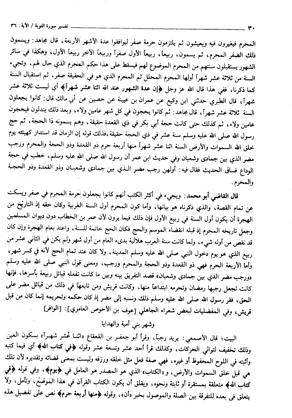 قال القاضي أبو محمد: ويجيء في أكثر الكتب أنهم كانوا يجعلون حرمة المحرم في صفر ويسكت عن تمام القصة، والذي ذكرناه هو بيانها، وأما كون المحرم أول السنة العربية وكان حقه إذ التاريخ من الهجرة أن يكون أول السنة في ربيع الأول فإن ذلك فيما يرون لأن عمر بن الخطاب دون ديوان المسلمين وجعل تاريخه المحرم إذ قبله انقضاء الموسم والحج فكان الحج خاتمة للسنة، واعتد بعام الهجرة وإن كان قد نقص من أوله شيء، ولما كانت سنة العرب هلالية بدىء العام من أول شهر ولم يكن في الثاني عشر من ربيع الذي هو يوم دخول النبي صلى الله عليه وسلم المدينة، ولا كان عند تمام الحج لأنه في كسر شهر، وأما الأربعة الحرم فهي ذو القعدة وذو الحجة والمحرم ورجب، ومعنى قول النبي صلى الله عليه وسلم «ورجب مضر الذي بين جمادى وشعبان» قصد التفريق بينه وبين ما كانت تفعله قبائل ربيعة بأسرها، فإنها كانت تجعل رجبها رمضان وتحرمه ابتداعا منها، وكانت قريش ومن تابعها في ذلك من قبائل مضر على الحق، فقر رسول الله صلى الله عليه وسلم ذلك ونسبه إلى مضر إذ كان حكمه وتحريمه إنما كان من قبل قريش، وفي المفضليات لبعض شعراء الجاهلي [عوف بن الأحوص العامري] : [الوافر] وشهر بني أمية والهدايا البيت قال الأصمعي: يريد رجبا، وقرأ أبو جعفر بن القعقاع «اثنا عشر شهرا» بسكون العين وذلك تخفيف لتوالي الحركات، وكذلك قرأ أحد عشر وتسعة عشر وقوله فِي كِتابِ اللَّهِ أي فيما كتبه وأثبته في اللوح المحفوظ أو غيره، فهي صفة فعل مثل خلقه ورزقه وليست بمعنى قضائه وتقديره لأن تلك هي قبل خلق السموات والأرض، و «الكتاب» الذي هو المصدر هو العامل في يَوْمَ، وفي قوله فِي كِتابِ اللَّهِ متعلقة بمستقرة أو ثابتة ونحوه، ويقلق أن يكون الكتاب القرآن في هذا الموضع، وتأمل، ولا يتعلق في بعده للتفرقة بين الصلة والموصول بخبر «أن» ، وقوله مِنْها أَرْبَعَةٌ حُرُمٌ نص على تفضيل هذه