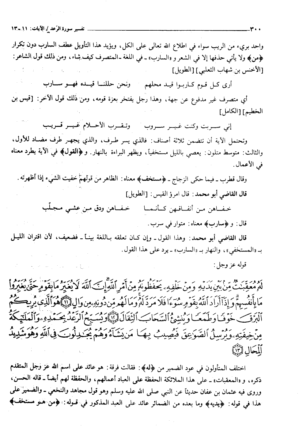 اختلف المتأولون في عود الضمير من لَهُ: فقالت فرقة: هو عائد على اسم الله عز وجل المتقدم ذكره، و «المعقبات» - على هذا الملائكة الحفظة على العباد أعمالهم، والحفظة لهم أيضا- قاله الحسن، وروى فيه عثمان بن عفان حديثا عن النبي صلى الله عليه وسلم وهو قول مجاهد والنخعي- والضمير على هذا في قوله: يَدَيْهِ وما بعده من الضمائر عائد على العبد المذكور في قوله: مَنْ هُوَ مُسْتَخْفٍ